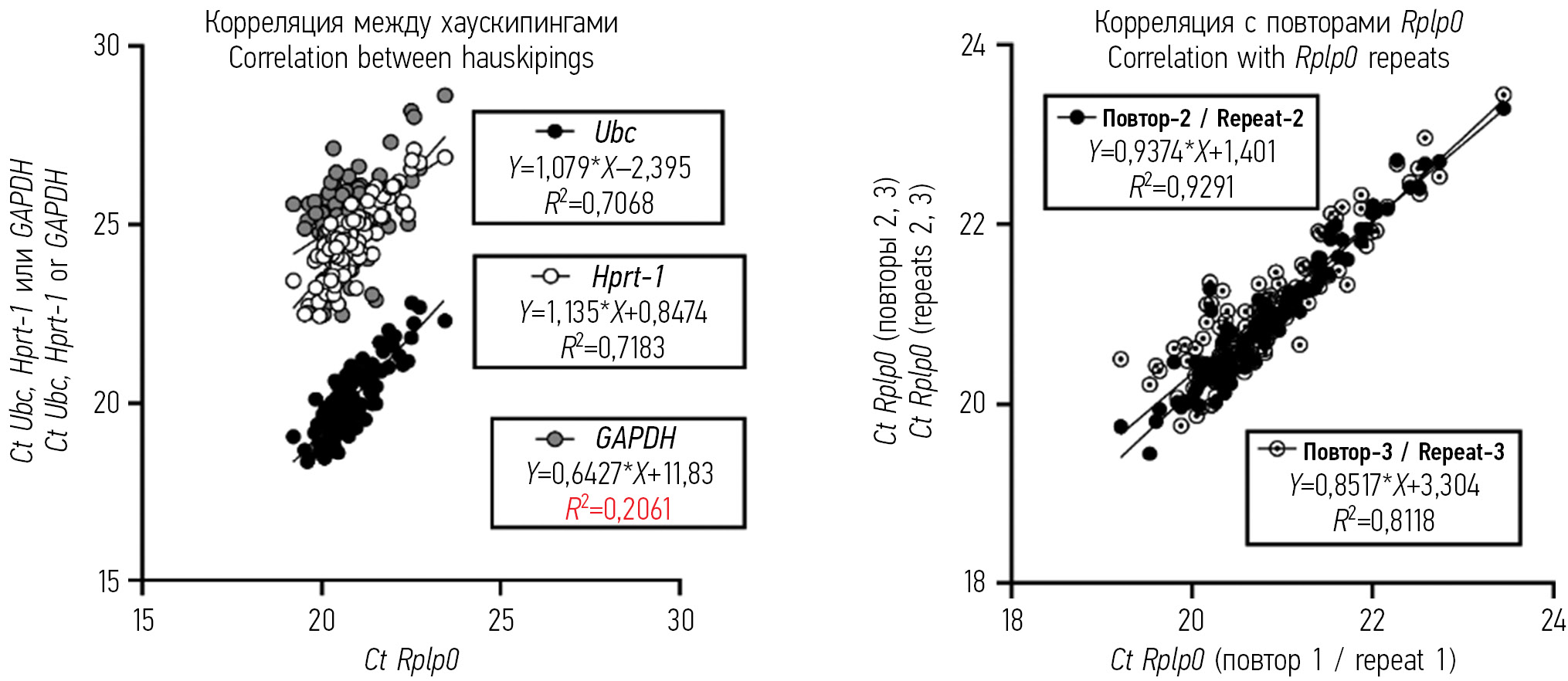 Во избежание случайных ошибок, обусловленных некорректным использованием нормировочных генов (для нормировки уровня экспрессии генов интереса были использованы четыре гена «домашнего хозяйства»), был проведен корреляционный анализ (см. рис. 1). Согласно полученным нами результатам, гены «домашнего хозяйства» Ubc и Hprt находятся в прямой (положительной) линейной связи с геном Rplp0 с расчетными коэффициентами R2 = 0,71 и 0,72 соответственно. Универсальный ген GAPDH, наиболее часто используемый в качестве эндогенного контроля, в нашем случае слабо коррелировал с нормировочным геном Rplp0.