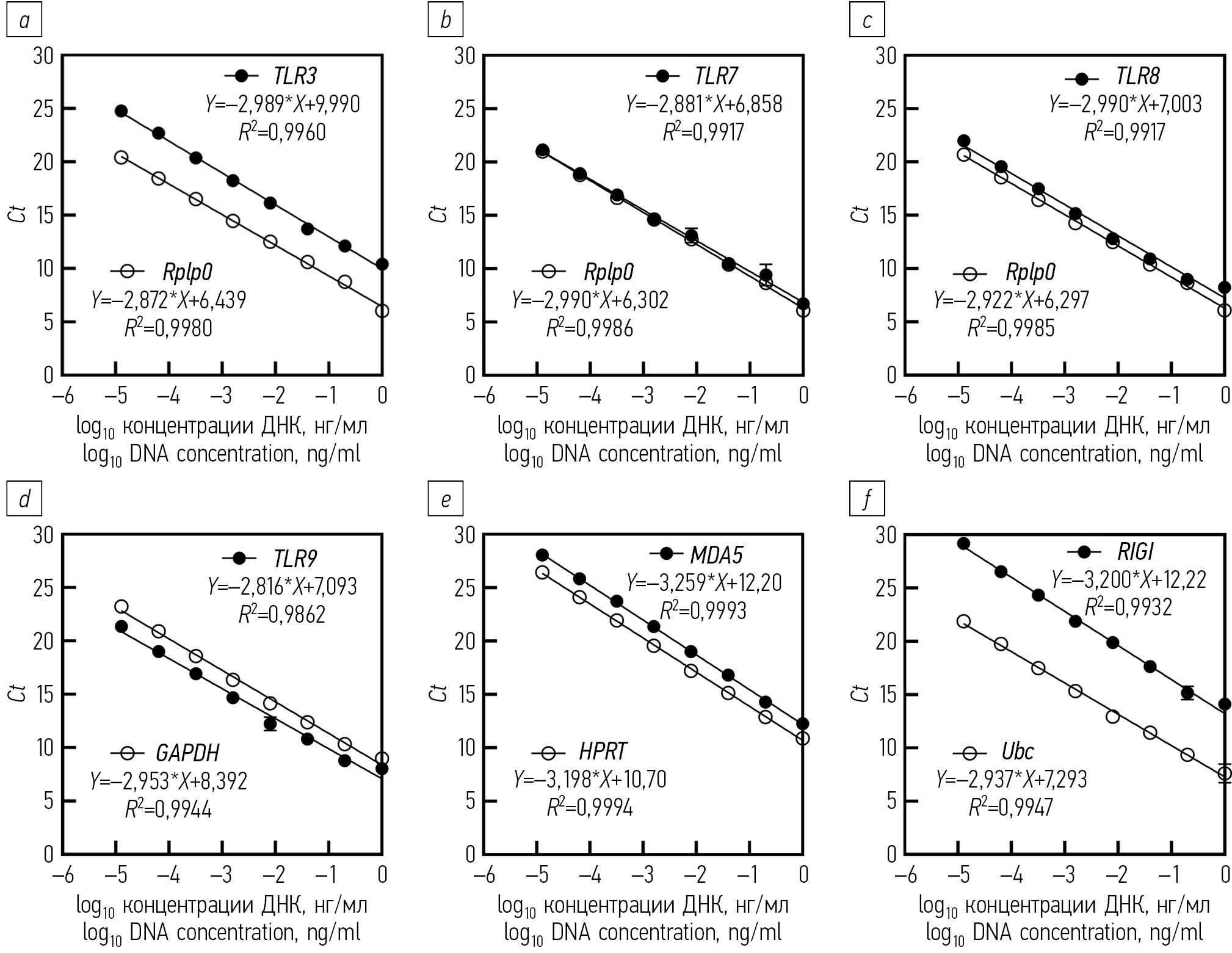 Рис. 2. Эффективность ПЦР в мультиплексном формате, стандартные калибровочные кривые: a — для генов TLR3 и Rplp0; b — для генов TLR7 и Rplp0; c — для генов TLR8 и Rplp0; d — для генов TLR9 и GAPDH; e — для генов MDA5 и Hprt; f — для генов RIGI и Ubc.