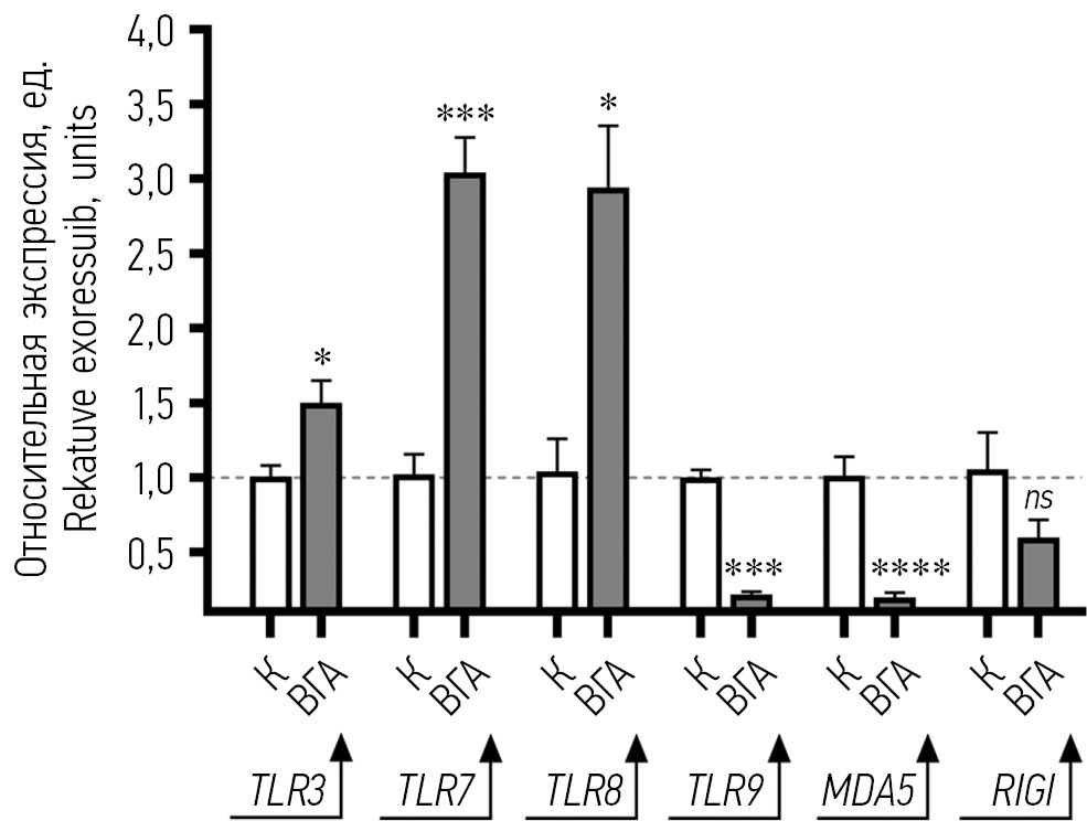 Рис. 3. Относительная экспрессия генов TLR3, TLR7, TLR8, TLR9, MDA5 и RIGI в легких мышей через 24 ч после интраназального инфицирования вирусом гриппа А/PR8/34 (H1N1); группа интактных животных (K) показана белыми столбиками. Достоверность различий в уровнях экспрессии в опытной группе (ВГА) по сравнению с контрольной (K) определяли с использованием непарного t-критерия Стьюдента: * p < 0,05; *** p < 0,001; **** p < 0,0001, ns — различия не значимы.