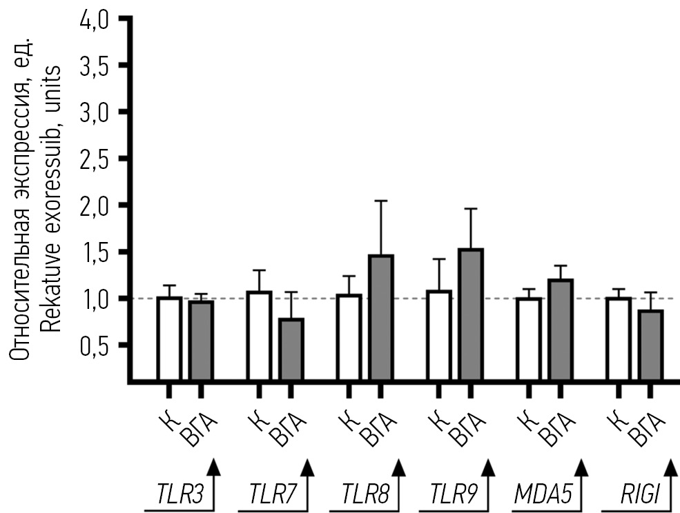 Рис. 4. Относительная экспрессия генов TLR3, TLR7, TLR8, TLR9, MDA5 и RIGI в селезенках мышей через 24 ч после интраназального инфицирования вирусом гриппа А/PR8/34 (H1N1); группа интактных животных (K) показана белыми столбиками. Достоверность различий в уровнях экспрессии в опытной группе (ВГА) по сравнению с контрольной (K) определяли с использованием непарного t-критерия Стьюдента. Статистически достоверных различий при сравнении опытной и контрольной группы не выявлено.