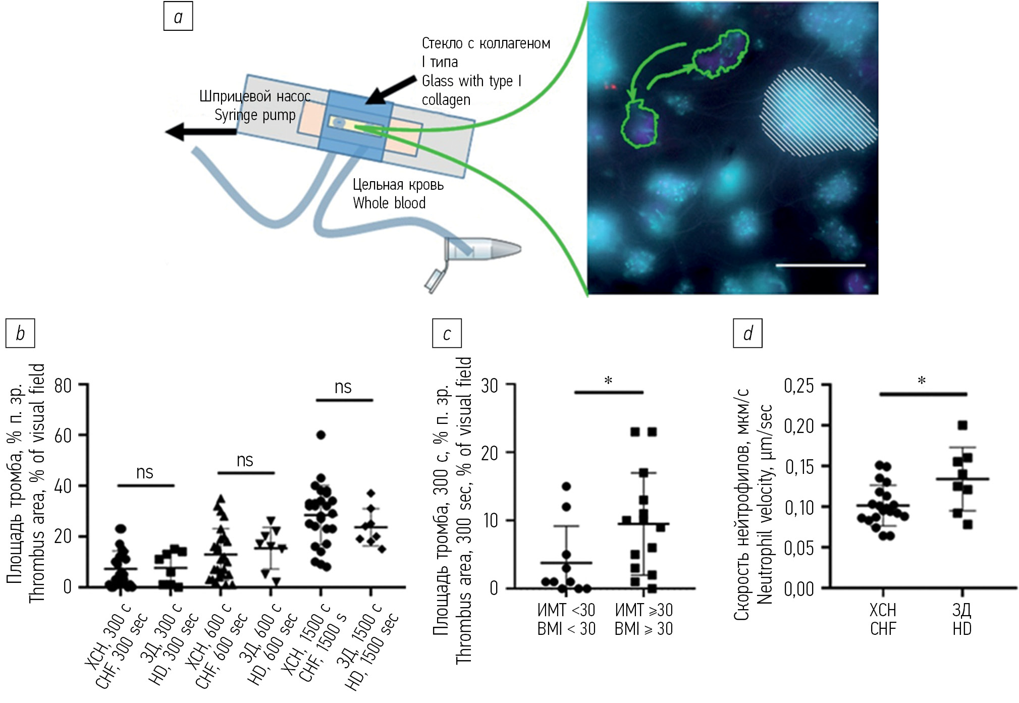 Рис. 1. Определение статуса тромбовоспаления у пациентов с хронической сердечной недостаточностью (ХСН): а — плоскопараллельная проточная камера и типичное поле зрения здорового донора на 25-й минуте эксперимента. Композитное изображение (окраска DiOC(6), Hoechst 33342 и Annexin V-Alexa 647). Штриховка — расположение растущего тромба, контуром обведены нейтрофилы, стрелки — траектории движения нейтрофила. Масштабный отрезок 25 мкм; b — площади тромба у пациентов с ХСН и здоровых людей (ЗД) на 300, 600 и 1500-й секундах съемки; c — тромбообразование у пациентов с разным индексом массы тела (ИМТ) на 300-й секунде; d — скорость движения нейтрофилов пациентов с ХСН и здоровых людей. * p < 0,05, ns — отсутствие статистически значимых различий. Статистическая значимость рассчитана с помощью теста Манна‒Уитни.