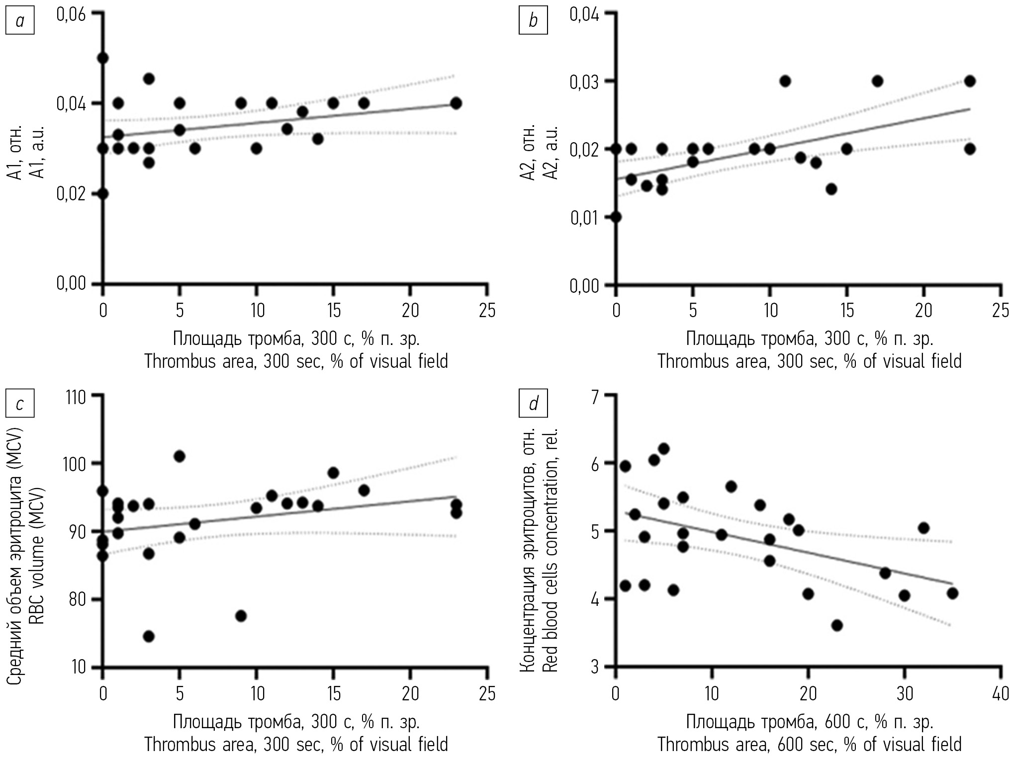 Рис. 2. Корреляция площади тромбов на 300-й секунде с параметрами агрегации эритроцитов A1 (а) и А2 (b), со средним объемом эритроцитов (c), c концентрацией эритроцитов на 600-й секунде (r = 0,4, p < 0,05) (d). Представлена линейная интерполяция данных (сплошная линия) и 95% доверительные интервалы (пунктир).