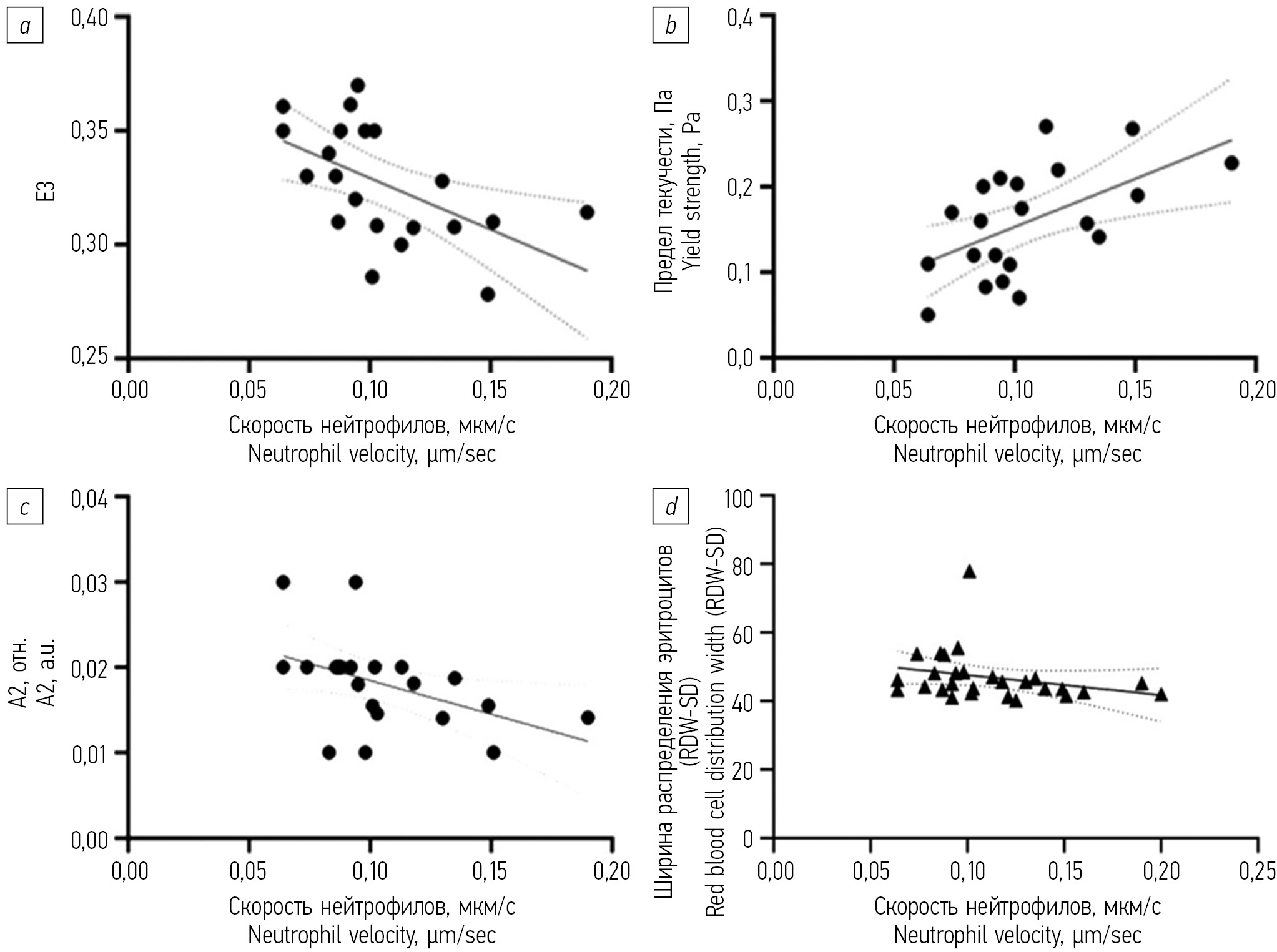 Рис. 3. Корреляция скорости движения нейтрофилов с параметром деформируемости эритроцитов E3 (а), с пределом текучести эритроцитов (b), с параметром агрегации A2 суспензии эритроцитов (с), с шириной распределения эритроцитов (d) для обобщенных данных по пациентам и здоровым донорам. Представлена линейная интерполяция данных (сплошная линия) и 95% доверительные интервалы (пунктир).