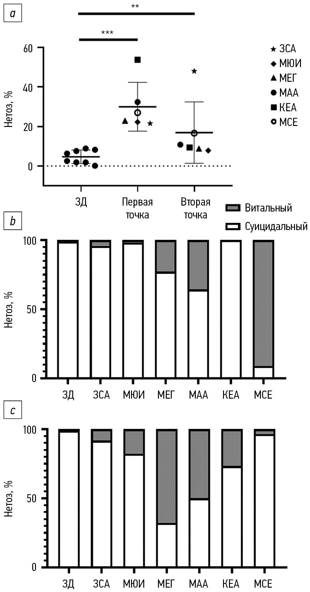 Рис. 1. Наблюдение нетоза в мазках плазмы крови. а — Доля нетозных нейтрофилов. Для сравнения со здоровыми донорами использовали критерий Манна–Уитни: **p <0,01, ***p <0,001. Между первой и второй точкой статистически значимой разницы нет (согласно парному критерию Вилкоксона при сравнении без ЗСА, p=0,06). Соотношение типов нетоза в первой (b) и второй (c) точках исследования. ЗД — группа здоровых доноров (n=8). ЗСА, МЮИ, МЕГ, МАА, КЕА, МСЕ — коды пациентов.