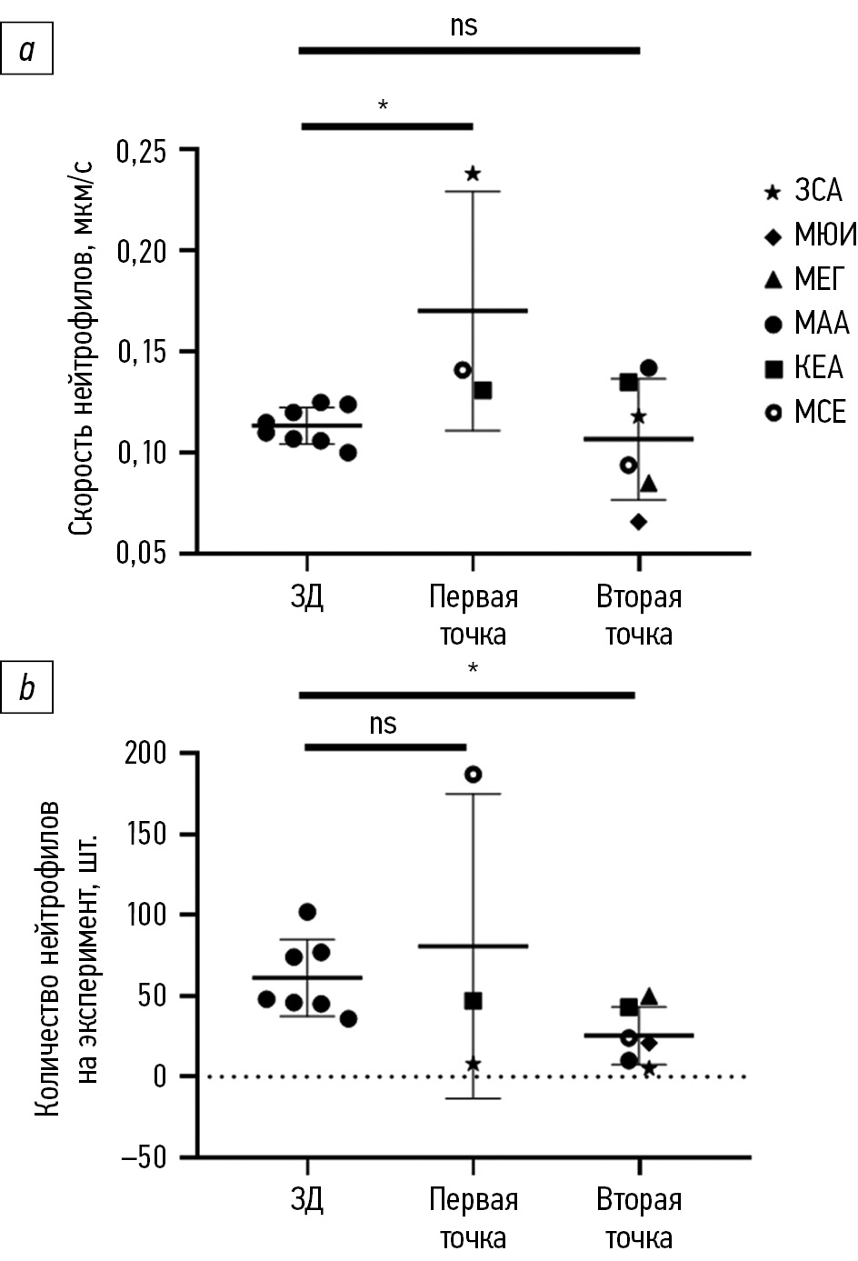 Нами также было показано нарушение скорости движения нейтрофилов по подложке: до начала терапии у пациентов наблюдалась сильная гетерогенность (см. рис. 2, а), что соответствует литературным данным [44]. После начала терапии у большинства пациентов снижалась скорость, при этом у двух из трех пациентов с нейтроцитозом, возможно связанным с эффектами G-CSF [45], скорость выходила за нижнюю границу нормы. Изменение подвижности нейтрофилов также может быть связано с эффектом G-CSF, так как данный фактор влияет на метаболизм нейтрофилов, в том числе на синтез аденозинтрифосфата [46]. Возможно, обратная миграция TAN также отражается на их способности к хемотаксису [47], как минимум при опухолевых заболеваниях наблюдается разделение нейтрофилов периферической крови на субпопуляции по плотности и функциям [48], так что в предлагаемом тесте, вероятно, наблюдается одна из субпопуляций. Кроме того, циклофосфамид [49] может приводить к праймингу нейтрофилов.