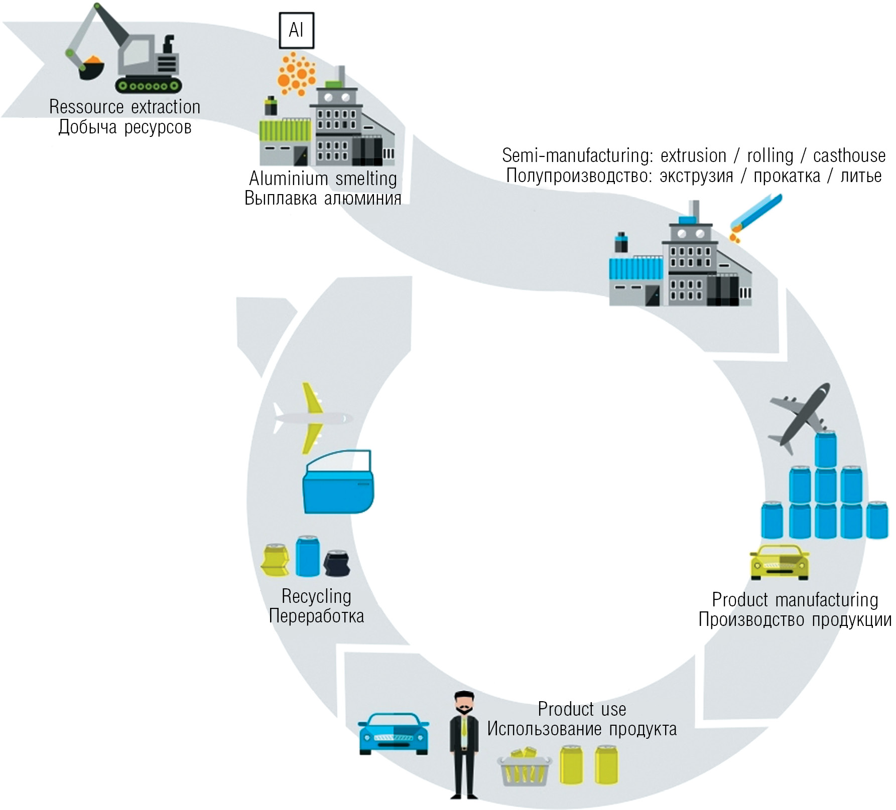 Aluminum ranks first regarding metal content in the soil, second in metal use, and is the third most abundant element. The figure illustrates the main stages of working with aluminum and its application.