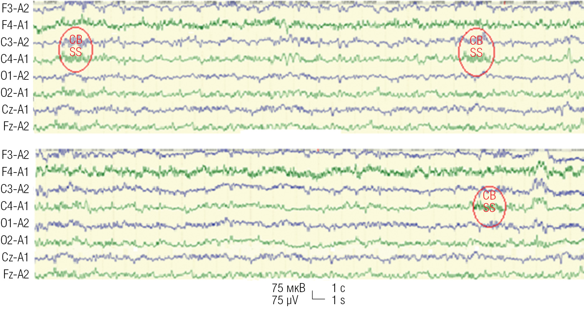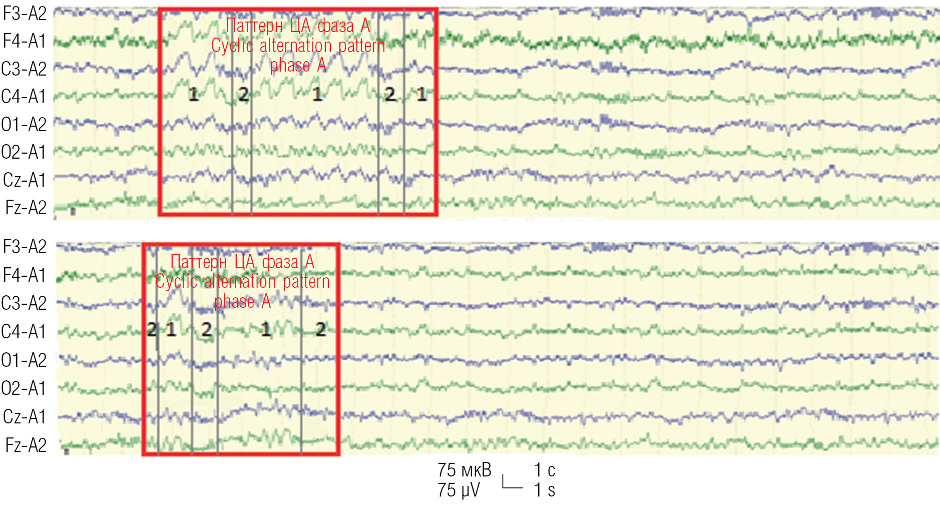 Примечание: ЭЭГ — электроэнцефалография; ЦА — циклические альтернации; А1 — подтип А1 фазы А паттерна ЦА; А2 — подтип А2 фазы А паттерна ЦА; А3 — подтип А3 фазы А паттерна ЦА; СВ — «сонные веретена».