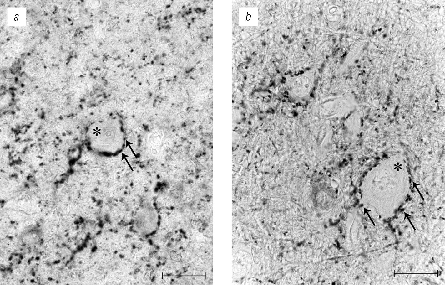 Рис. 1. ГАМК-эргические окончания на пирамидном нейроне коры большого мозга: a — головной мозг крысы; иммуногистохимическая реакция на GAD67 с использованием поликлональных кроличьих антител; b — головной мозг кролика; иммуногистохимическая реакция на GAD67 с использованием моноклональных мышиных антител. Об. ×100. Стрелки указывают на синаптические терминали ГАМК-эргических нейронов, звездочка — на пирамидные нейроны