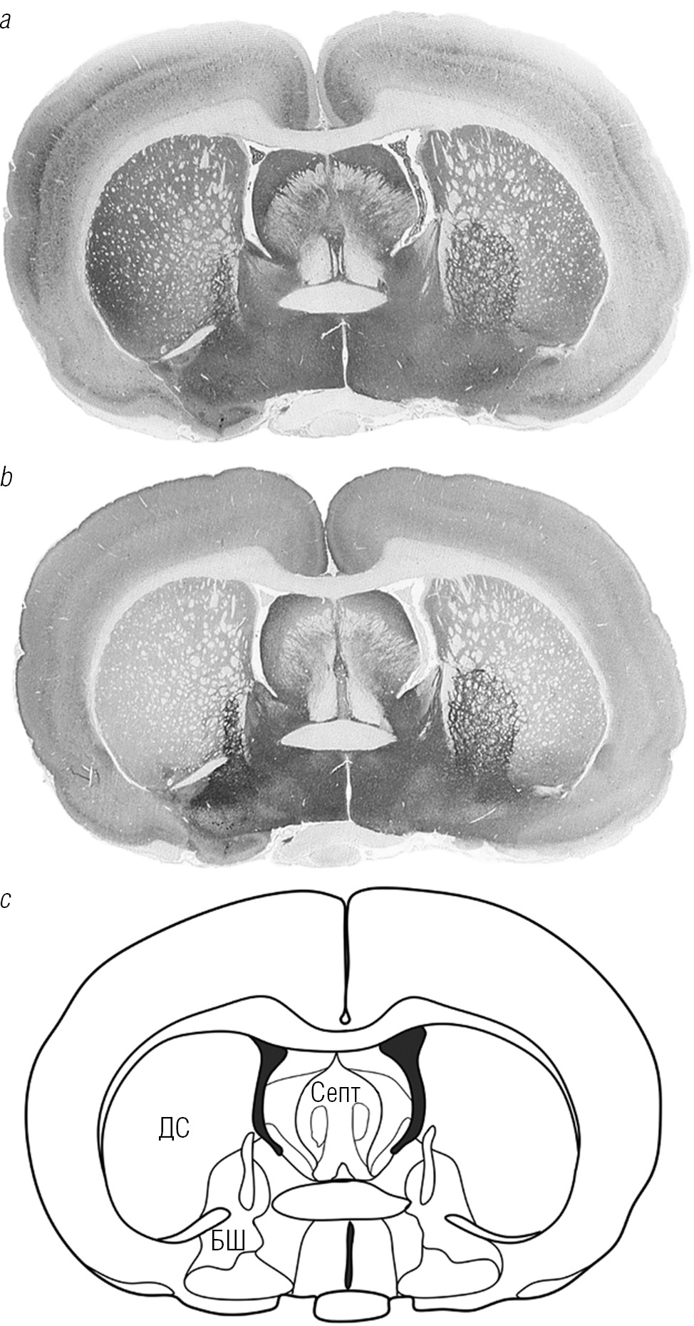 Рис. 2. Глутаматдекарбоксилаза в структурах конечного мозга крысы. Фронтальные срезы на уровне –0,4 мм от Брегмы: a — распределение GAD67; b — распределение GAD65; c — схема структур конечного мозга. ДС — дорсальный стриатум (хвостатое ядро и скорлупа); БШ — бледный шар; Септ — септальная зона