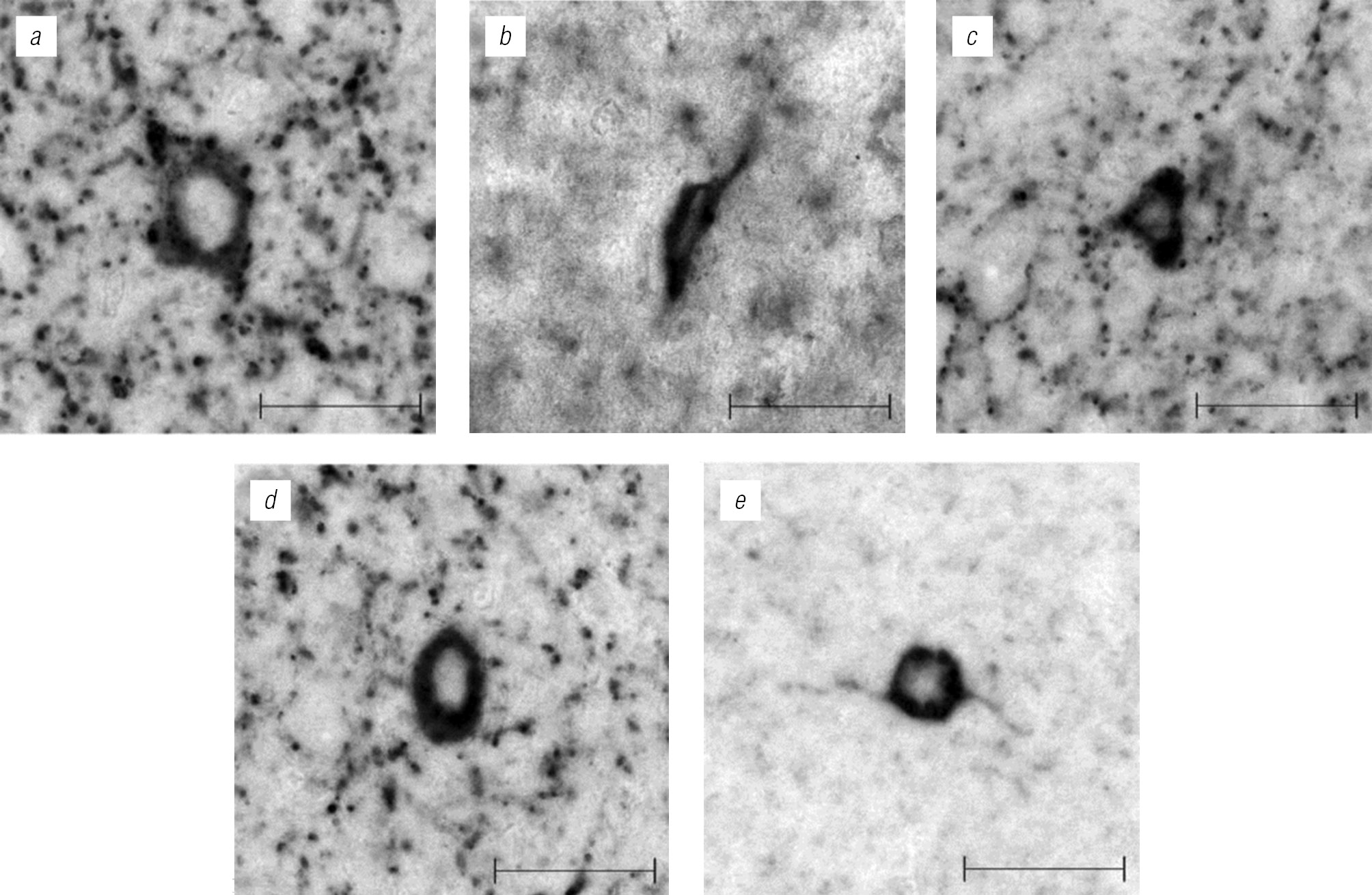 Рис. 3. ГАМК-эргические нейроны в коре головного мозга крыс: a — звездчатый нейрон; b — веретеновидный нейрон; c — треугольный нейрон; d — овальный нейрон; e — круглый нейрон. Об. ×100