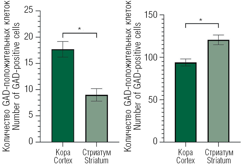 Анализировали и фотографировали гистологические препараты с помощью микроскопа Leica DM750 и фотокамеры ICC50 (Leica, Германия). Статистический анализ полученных изображений проводили в программах ImageJ [Wayne Rasband (NIH), США] и GraphPad Prism 8 (GraphPad Software, США). Определяли площадь (area) и количество GAD67-положительных клеток. Для количественной оценки GAD67-положительных клеток во всей изучаемой области производили подсчет по четырем полям зрения при увеличении ×40 для каждого случая и затем определяли количество на единицу площади (1 мм2). Данные представляли в виде среднего ± ошибка среднего. На основании проверки соответствия распределения нормальному по критерию Шапиро – Уилка межгрупповое сравнение значений проводили при помощи непараметрического критерия Манна – Уитни. Различия считали значимыми при p < 0,05.