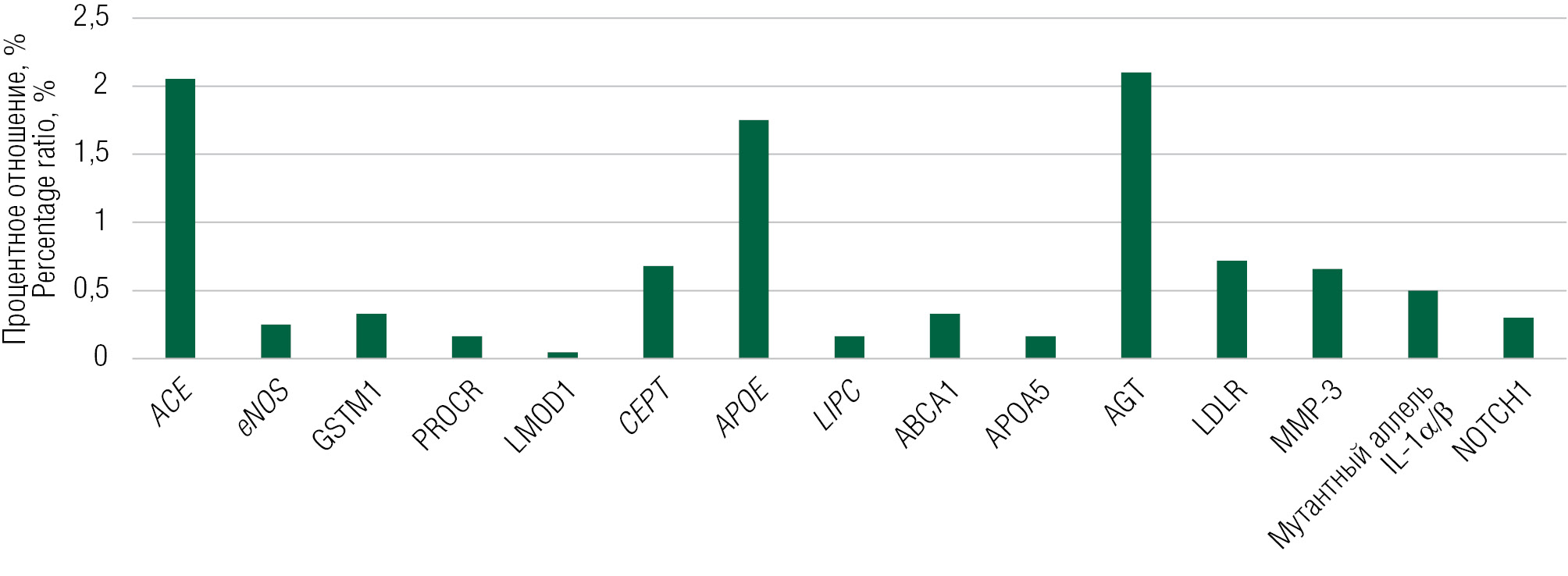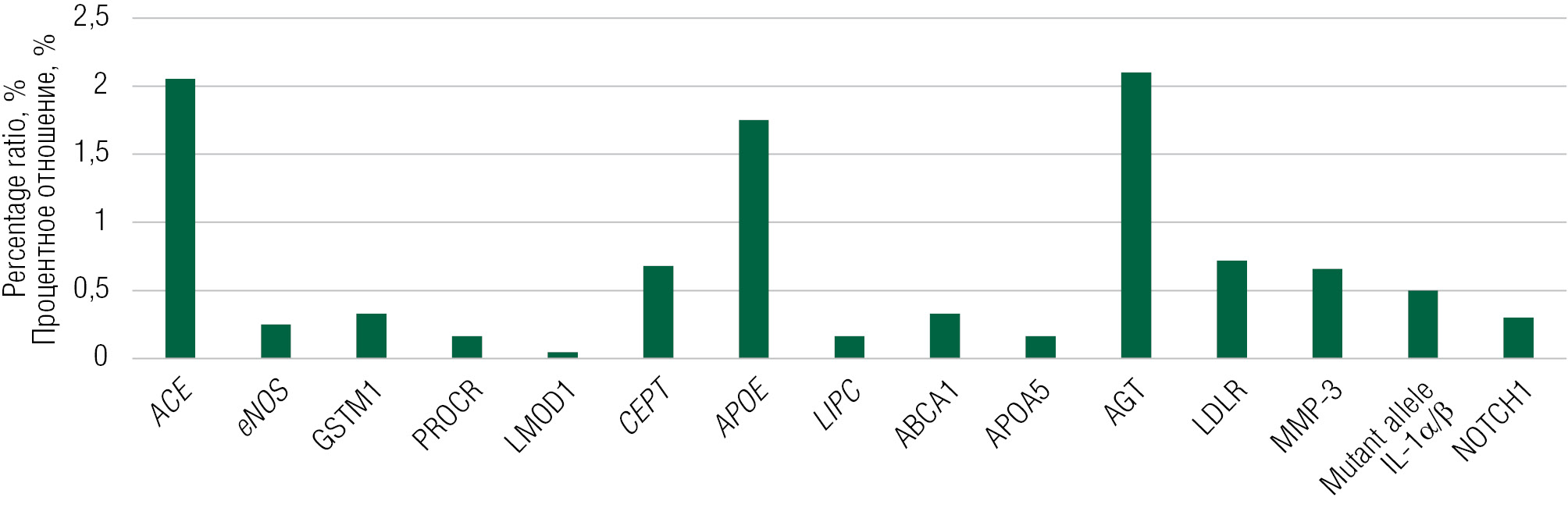Как и в случае с метаболомными маркерами, анализ полученных данных был проведен в виде определения процентного отношения каждого геномного маркера к общей выборке документов, относящихся к маркерам ССЗ.