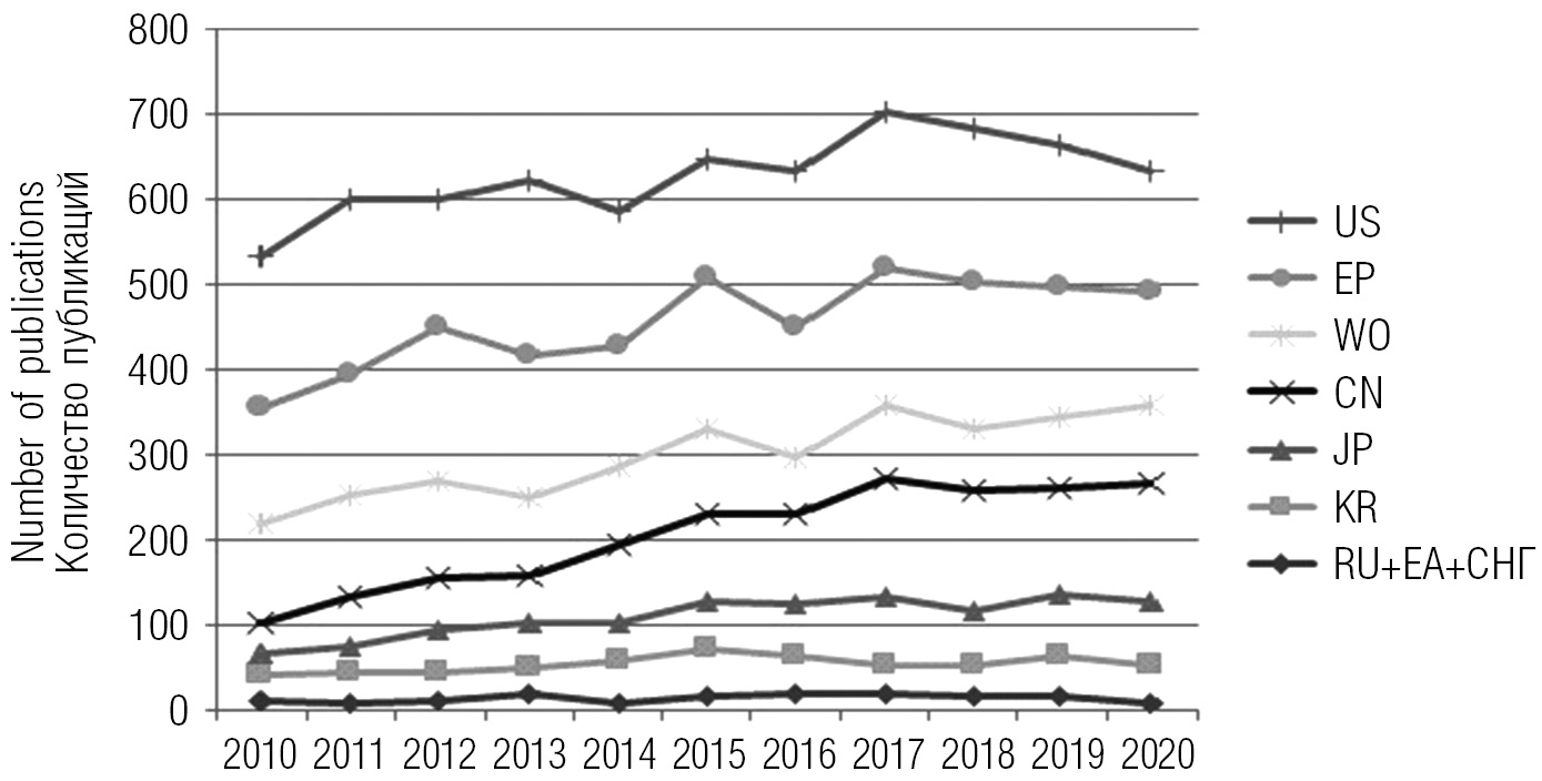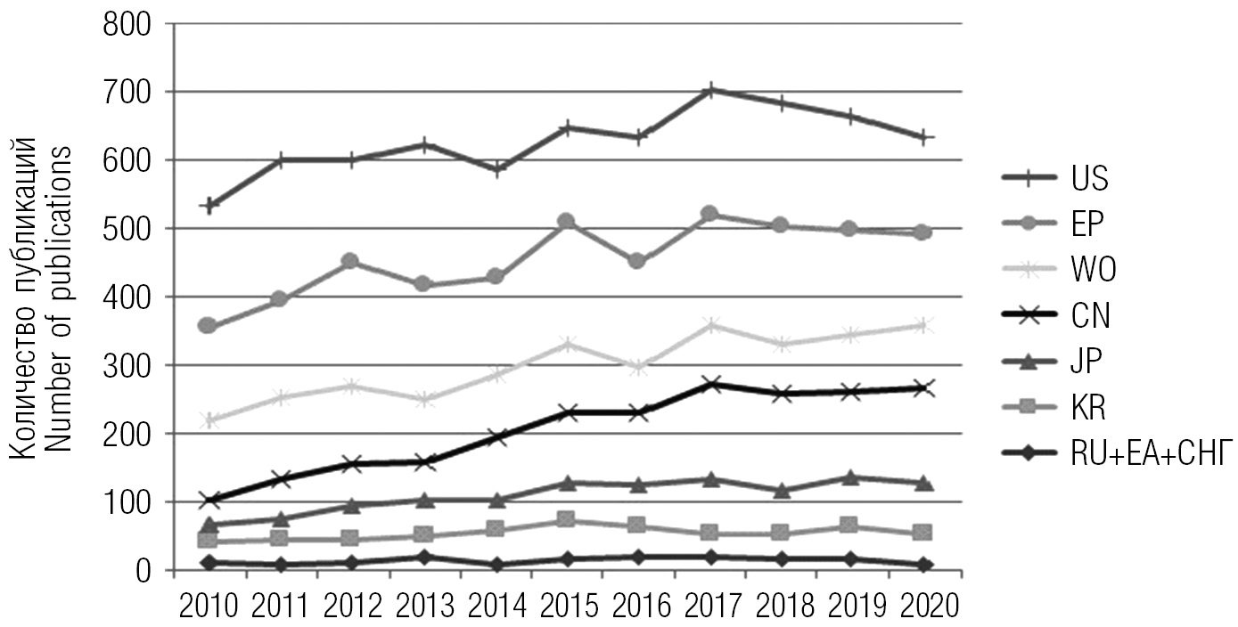 Рис. 4. Динамика публикаций патентных документов на маркеры сердечно-сосудистых заболеваний за 2010–2020 гг. по странам. US — Соединенные Штаты Америки; EP (ЕПВ) — Европейское патентное ведомство; WO (ВОИС) — Всемирная организация интеллектуальной собственности; CN — Китай; JP — Япония; KR — Южная Корея; RU+EA+СНГ — Россия + Евразийское патентное ведомство + Содружество Независимых Государств