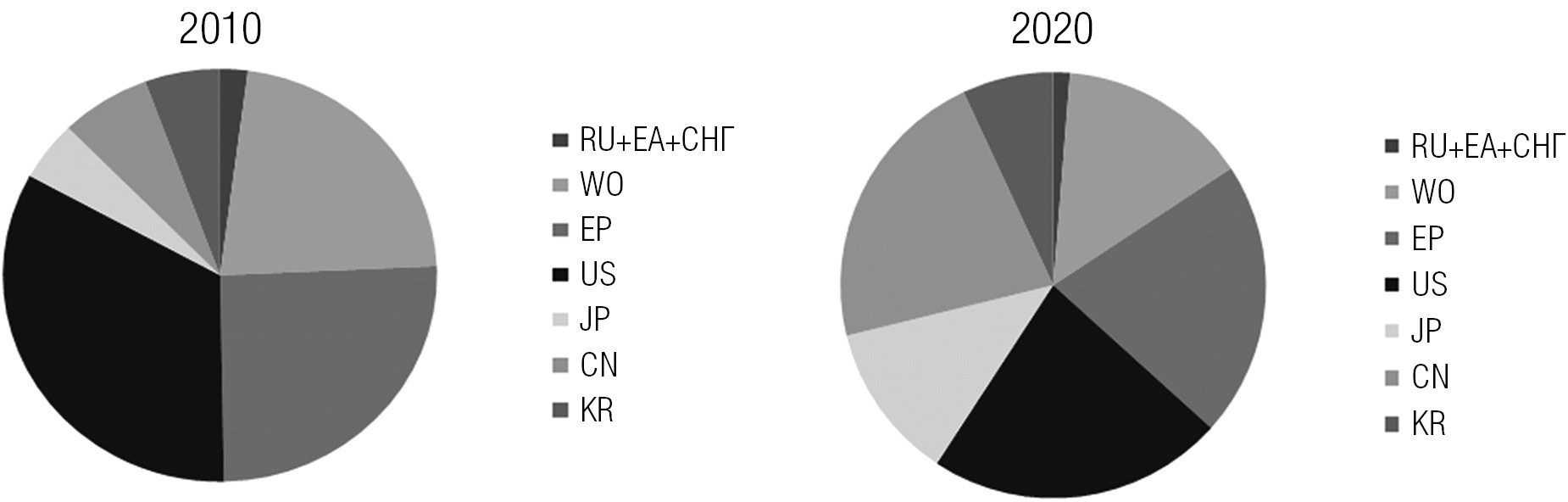 Рис. 5. Соотношение публикаций патентных документов на маркеры сердечно-сосудистых заболеваний по странам за 2010 и 2020 гг. RU+EA+СНГ — Россия + Евразийское патентное ведомство + Содружество Независимых Государств; WO (ВОИС) — Всемирная организация интеллектуальной собственности; EP (ЕПВ) — Европейское патентное ведомство; US — Соединенные Штаты Америки; JP — Япония; CN — Китай; KR — Южная Корея