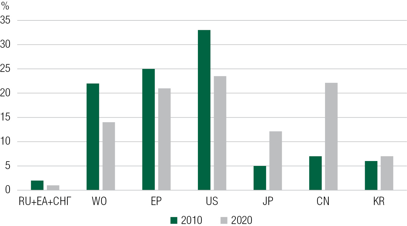 Следует обратить внимание на изменение публикационной активности в 2010 и 2020 гг. в процентах к общему числу публикаций патентных документов по выбранным для анализа странам (рис. 6).