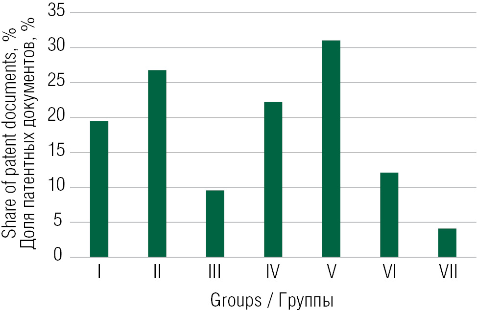 Рис. 1. Доля патентных документов определенной группы маркеров в общей выборке. Здесь и на рис. 3: группа I — маркеры функции левого желудочка и нейроэндокринной активации; группа II — воспалительные маркеры; группа III — маркеры системы гемостаза (факторы коагуляции); группа IV — маркеры-предикторы нарушений липидного обмена; группа V — маркеры фиброза миокарда; группа VI — маркеры некроза миокарда; группа VII — маркеры эндотелиальной дисфункции