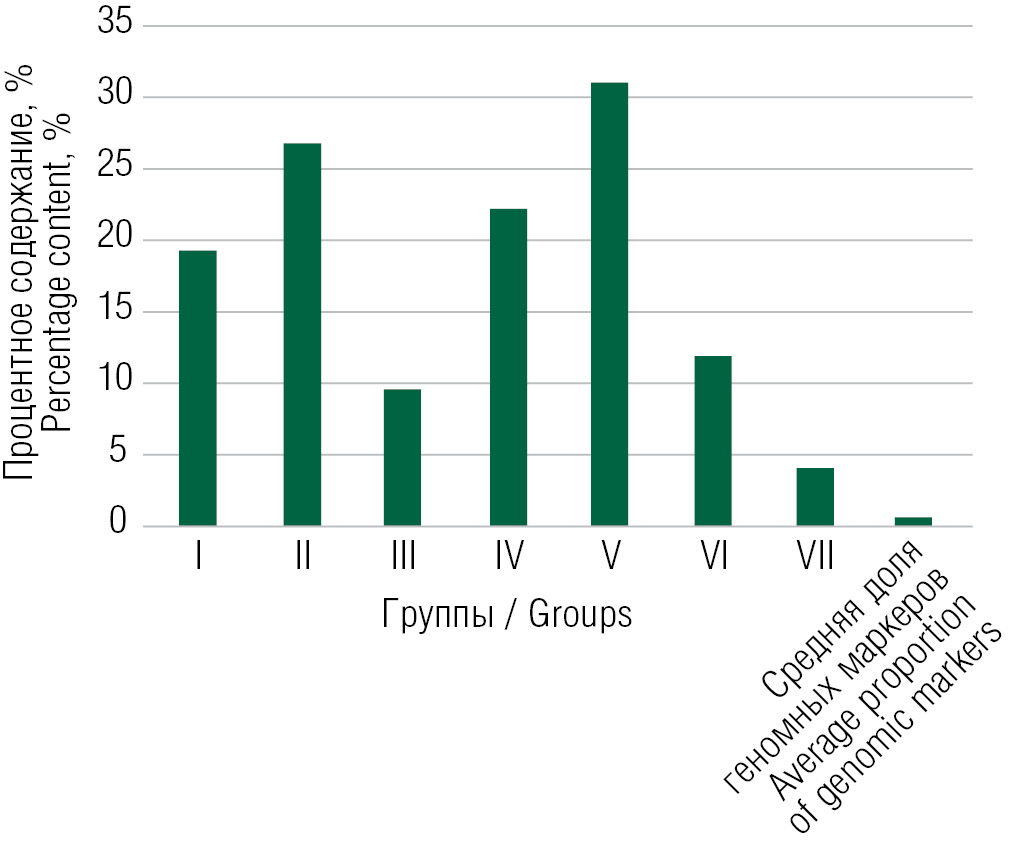 Fig. 1. The share of patent documents of a certain group of markers in the total sample. Here and in Fig. 3: group I — markers of left ventricular function and neuroendocrine noisy activation; group II — inflammatory markers; group III — markers of the hemostasis system (factors of coagulation); group IV — markers predictors of impairment lipid metabolism; group V — markers of fibrosis for the myocardium; group VI — markers of myocardial necrosis; group VII — markers of endothelial dysfunction