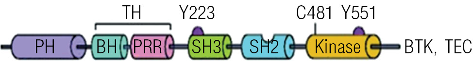 BTK — один из пяти членов семейства нерецепторных тирозинкиназ, экспрессируемых в гепатоцеллюлярной карциноме (TEC), состоит из пяти различных доменов для взаимодействия с белками. Эти домены содержат аминоконцевой домен гомологии плекстрина (PH), богатый пролином домен гомологии TEC (TH), гомологичные домены SRC (SH) SH2 и SH3, а также киназный домен с ферментативной активностью (рис. 1).