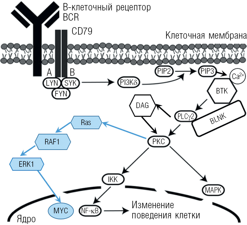 В условиях хронической активации BCR и последующей передачи сигналов в клетках ХЛЛ наблюдается конститутивная активация киназ, связанных с различными путями проведения сигналов от BCR. Среди киназ, задействованных при конститутивной активации клеток В-ХЛЛ и определяющих их выживание, выявлены брутоновская тирозинкиназа (BTK), протеинкиназа В (AKT), внеклеточная сигнальная киназа (ERK), обеспечивающие активацию транскрипционного фактора NF-κB [31–33].