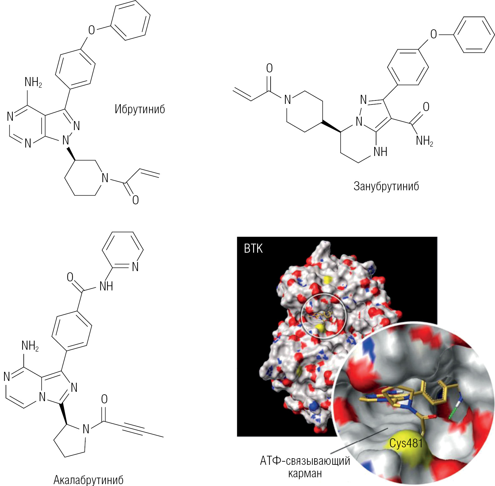 Рис. 3. Химические структуры необратимых ингибиторов тирозинкиназы Брутона (BТК), справа снизу — модель связывания акалабрутиниба с BTK в АТФ-связывающем кармане (адаптировано из [65])