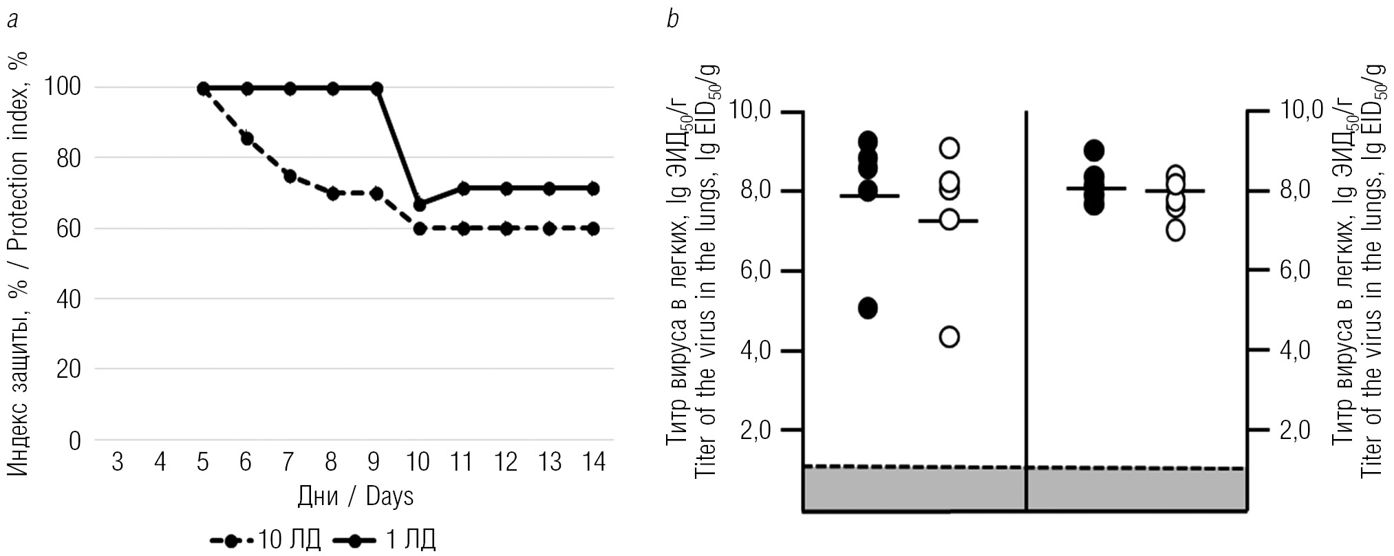 Figure. Protection of the mice from lethal viral pneumonia using silver nanoparticles (AgNPs). Mice were intranasally injected with 1 LD50 and 10 LD50 of the H1N1pdm09 influenza virus and observed daily for 14 days: а — protection index (the ratio of mortality in the control group to mortality in the experimental group); b — replication of the influenza virus in the mice lungs on the 3rd day after infection. EID50 — average embryonic infectious dose