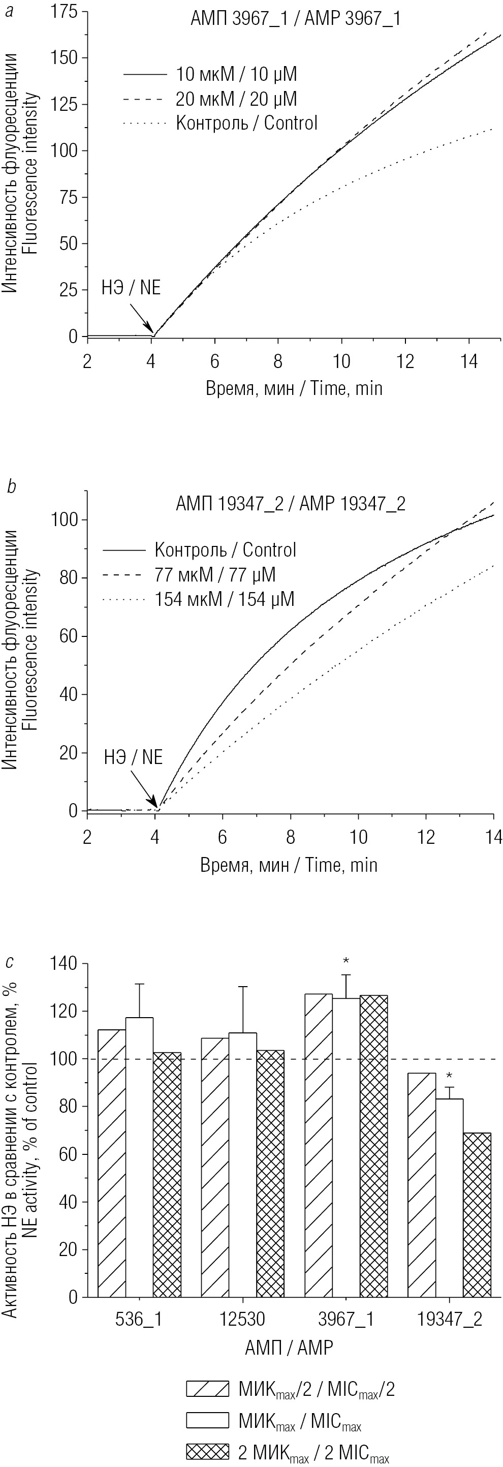 Рис. 2. Влияние антимикробных пептидов (АМП) на ферментативную активность нейтрофильной эластазы (НЭ). Типичные кинетические кривые (a, b) увеличения интенсивности флуоресценции аминометилкумарина, образующегося при расщеплении специфического субстрата MeOSuc-AAPV-AMC (20 мкМ) очищенной НЭ (50 нМ) в отсутствие и в присутствии АМП 3967_1 (a) и 19347_2 (b) в различных концентрациях (указаны на легенде). Момент добавления НЭ отмечен стрелкой. Длина волны возбуждения флуоресценции — 380 нм, регистрации — 460 нм. Зависимость ферментативной активности очищенной НЭ от концентрации АМП (c). За 100 % принята активность НЭ в отсутствие АМП. МИКmax — максимальное значение среди минимальных концентраций АМП, необходимых для достижения 100 % ингибирования роста микроорганизмов Escherichia coli, Chlamydia trachomatis и Bacillus subtilis в стандартном тесте. *p < 0,05 по сравнению с активностью НЭ в контроле (в отсутствие АМП)