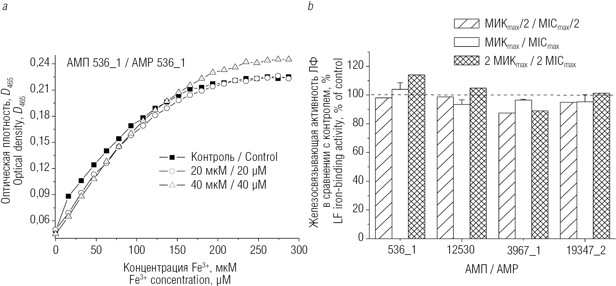 Рис. 3. Влияние антимикробных пептидов (АМП) на железосвязывающую активность лактоферрина (ЛФ): a — типичные кинетические кривые изменения оптической плотности раствора ЛФ (10 мг/мл) на длине волны 465 нм, соответствующей пику поглощения насыщенной железом формы ЛФ (холо-ЛФ), в отсутствие и в присутствии АМП 536_1 в различных концентрациях после 20 последовательных добавок соли железа [NH4Fe(SO4)2 · 12 H2O] (по 16 мкМ); b — влияние АМП 536_1, 12530, 3967_1 и 19347_2 в различных концентрациях на железосвязывающую активность ЛФ. МИКmax — максимальное значение среди минимальных концентраций АМП, необходимых для достижения 100 % ингибирования роста микроорганизмов Escherichia coli, Chlamydia trachomatis и Bacillus subtilis в стандартном тесте. За 100 % принята железосвязывающая активность ЛФ в контроле (в отсутствие АМП)