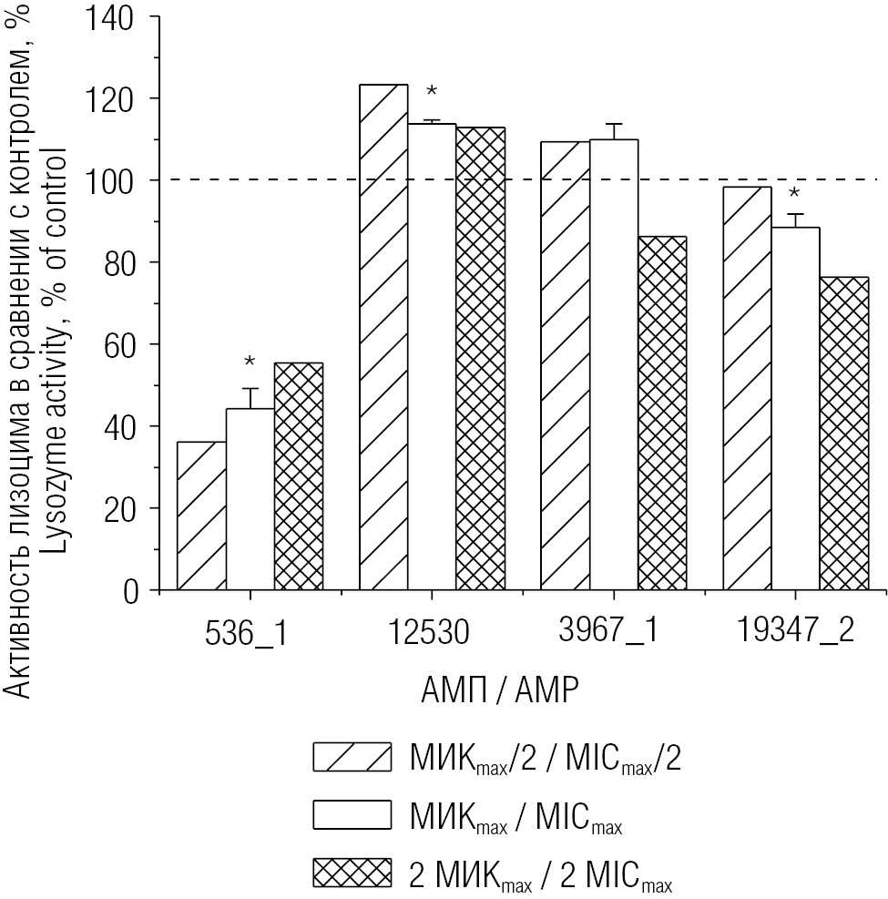 Fig. 4. Effect of AMP 536_1, 12530, 3967_1, and 19347_2 at various concentrations on lysozyme ability to lyse M. lysodeikticus bacterial cells. Lysozyme mucolytic activity in the control (in the absence of AMP) was taken as 100%. MICmax — minimal inhibitory concentrations against three bacterial species (Escherichia coli, Chlamydia thrachomatis and Bacillus subtilis). *p < 0.05 compared to lysozyme activity in the control (in the absence of AMP)