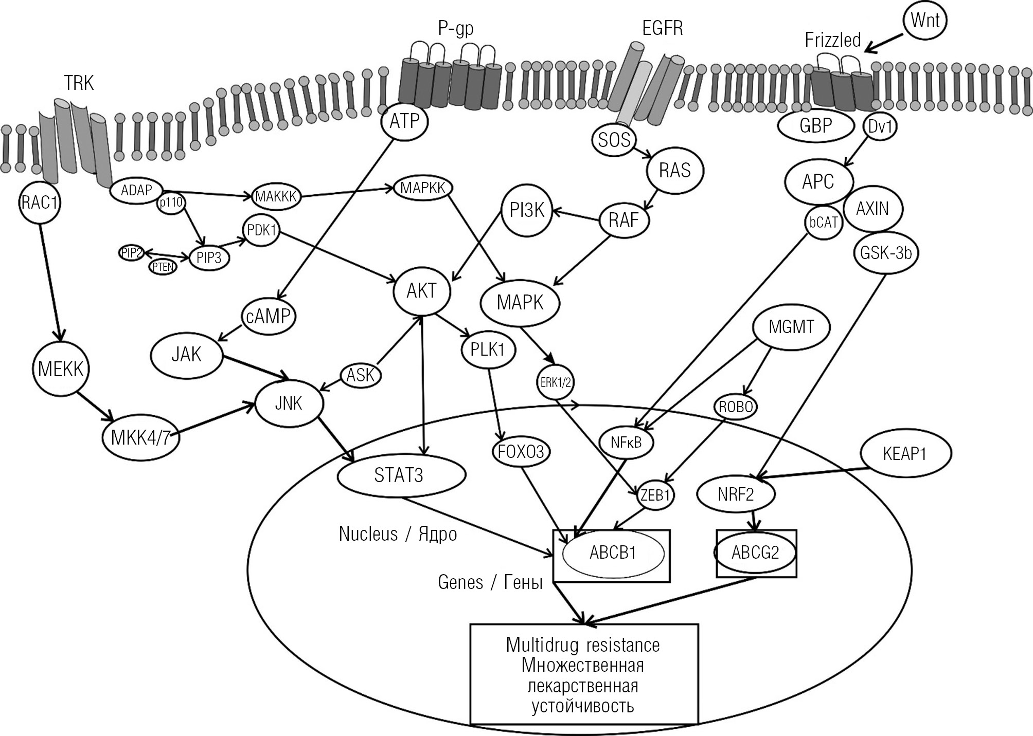 Figure. Intracellular mechanisms of multidrug resistance of glioblastoma involving genes ABCB1 and ABCG2. See text for explanations / Рисунок. Внутриклеточные механизмы множественной лекарственной устойчивости глиобластомы с участием генов ABCB1 и ABCG2. Объяснения см. в тексте