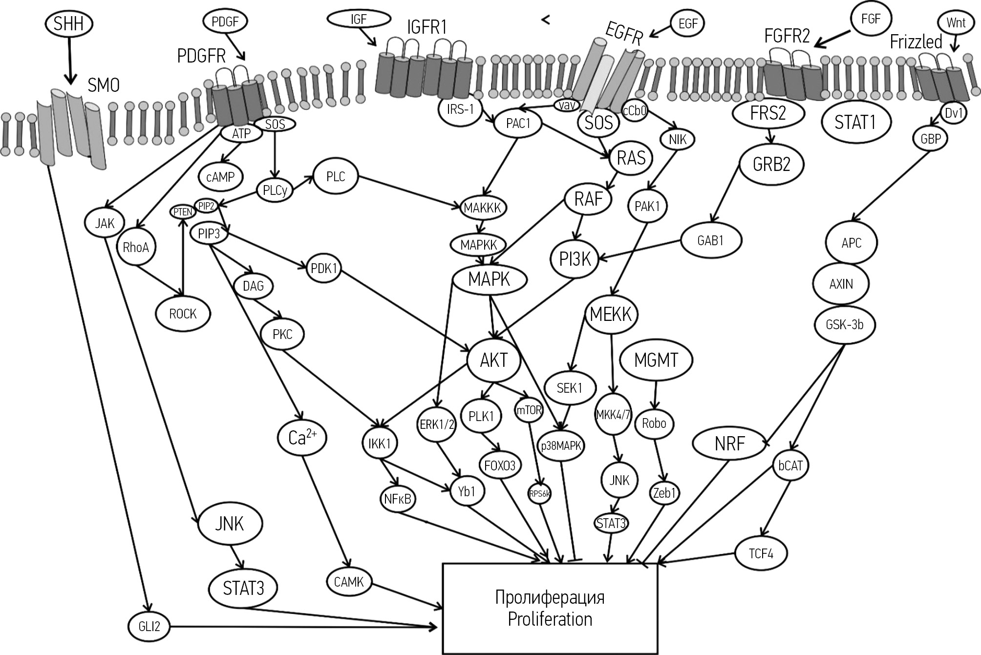 Рисунок. Сигнальные механизмы, участвующие в пролиферации глиобластомы (см. текст и список сокращений)