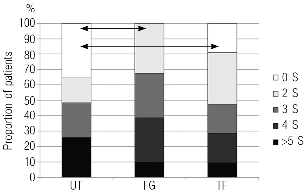 Fig. 1. Proportion of multiple sclerosis patients according to number of symptoms. UT — untreated; FG — Fingolomod-treated; TF — Teriflunomide-treated; 0 S — without symptoms; 2 S, 3 S, 4 S, >5 S — two, three, fore, and five and more symptoms GIT disorders from table 2
