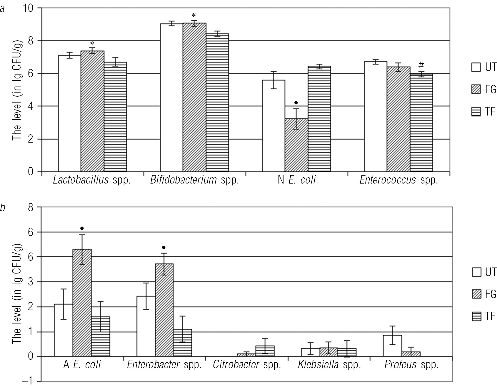 Fig. 2. The level of symbiotic (a) and opportunistic (b) bacterial species in intestinal microbiota of multiple sclerosis patients with Fingolimod or Teriflunomide therapy (culture method). Data represented as mean ± standard error. In Y axis – the bacterial level in lg colony forming units (CFU) on fecal g; in Х axis – bacterial species found; UT – untreated, FG – Fingolimod-treated, TF – Teriflunomide-treated. ANOVA with post-hoc HSD for unequal N, * difference between FG and TF groups, •differences from UT and TF groups, # differences from UT group, p < 0.05. N — normal, A — atypical