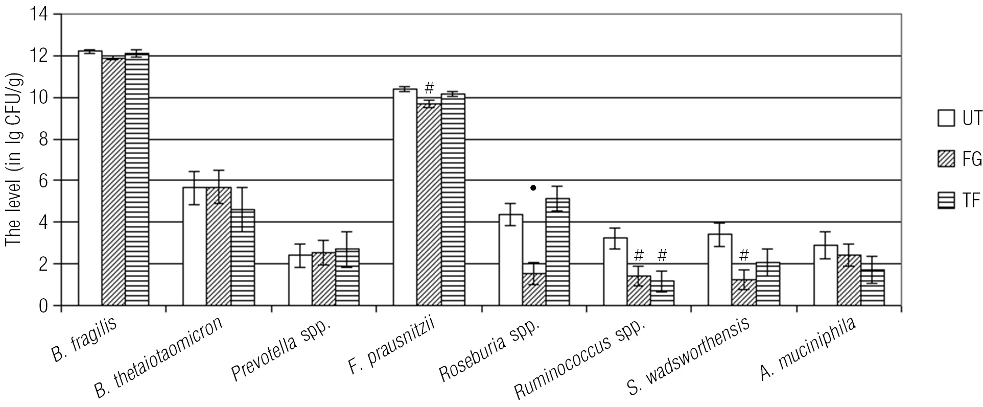 Fig. 3. Changes in bacterial levels in Fingolimod- and Teriflunomide-treated patients with multiple sclerosis (PCR method). Data represented as mean ± standard error. In Y axis — the bacterial level in lg colony forming units (CFU) on fecal g; in Х axis — bacterial species; UT — untreated, FG — Fingolimod-treated, TF — Teriflunomide-treated. ANOVA with post-hoc HSD for unequal N, * differences between FG and TF groups, • differences from UT and TF groups, # differences from UT group, p < 0.05