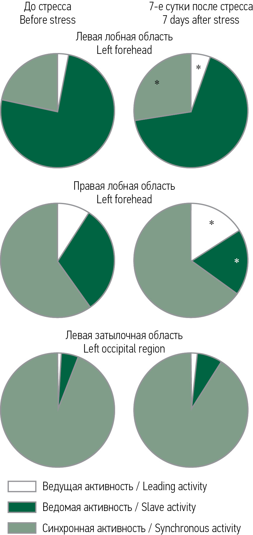 С помощью анализа кросскорреляционных связей биоэлектрической активности исследуемых зон по отношению к правой затылочной области на 7-е сутки после стресса выявлены следующие отличия от контрольных показателей. В левой лобной области увеличена доля «ведущей» и «синхронной» активности ЭКоГ и отмечено «отсутствие связи» (3 %); в правой лобной области наблюдалось увеличение «ведущей» и снижение «ведомой» ЭКоГ-активности по отношению к правой затылочной области. В левой затылочной области по отношению к правой затылочной области достоверные изменения отсутствовали (рис. 1).
