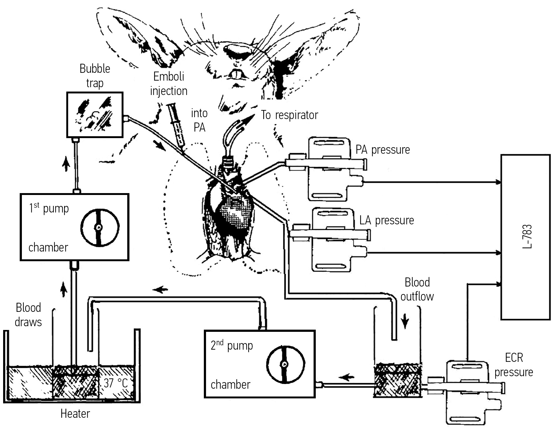 After anesthesia rabbits were placed in a supine position and fixed on a heating table, and 1 ml of blood was taken from left jugular vein into syringe and catheter (15 cm long with an approximately 0.8 mm inner diameter). 10–15 cylindrical emboli (diameter 0.8 mm, length 1–1.5 mm) were made within 1 hr. after the removal of the blood clots from the syringe and catheter. This method of preparing blood clots was modified from the study of H.M. Chen et al. [7]. Then heparin (1000 U/kg) was injected into left jugular vein, left carotid artery was catheterized, and blood was removed from this artery into the heating reservoir, and as much blood as possible was collected. To fill completely the perfusion system 100–150 ml of dextran solution was added, and the total volume of perfusion system was nearly 300 ml. Sternum was removed, pericardium dissected, aorta, cranial and caudal veins were ligated to prevent retrograde blood flow. Pulmonary artery and left atrium were cannulated with plastic tubes diameter 4–5 mm, which were connected to the pump and then the lungs were perfused.