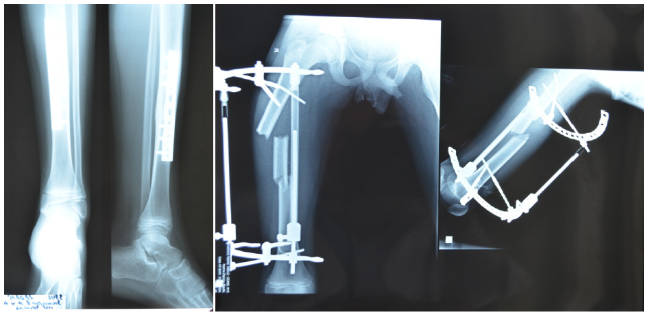 Рис. 1. Больной З., 11 лет. Рентгенограммы после открытого остеосинтеза пластиной большеберцовой кости, внеочагового остеосинтеза бедра с целью транспортировки