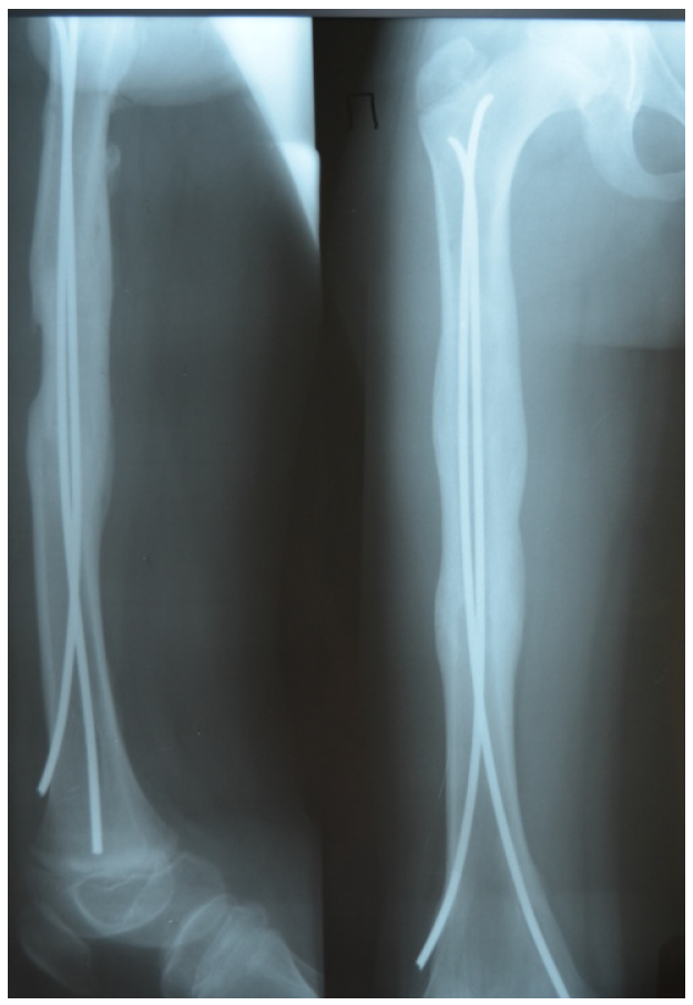 У ребенка сохранялось грубое смещение полифрагментарного перелома бедра после наружного остеосинтеза, однако создание покоя для конечности дало возможность транспортировать больного в краевой центр для следующего этапа операции. При поступлении больного в клинику через 12 дней после ДТП и нормализации вегетативных функций осуществили повторную операцию. Вмешательство проведено закрыто, фиксация эластичными стержнями. Наступила консолидация в обычные сроки (рис. 2). Пластина и стержни удалены одновременно через полгода после травмы. Двойной уровень перелома и длительно не устраненное смещение на результат не повлияли.