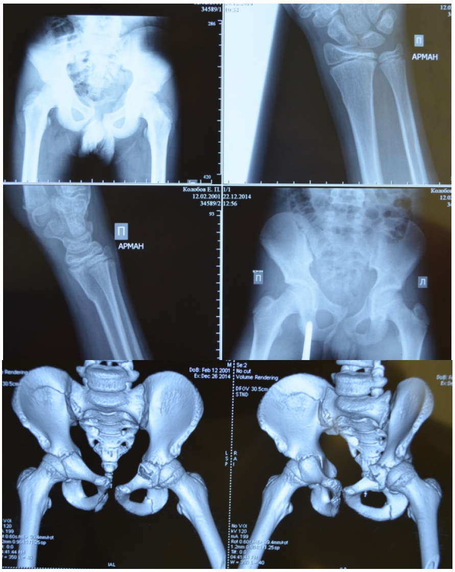4. Fig. 3. Patient K., 13 years old. Trauma with crushing the pelvis under the wheels of the car. The diagnosis is refined by spiral computed tomography: comminuted intraarticular fracture of the acetabulum on the left, violation of the anterior pelvic ring