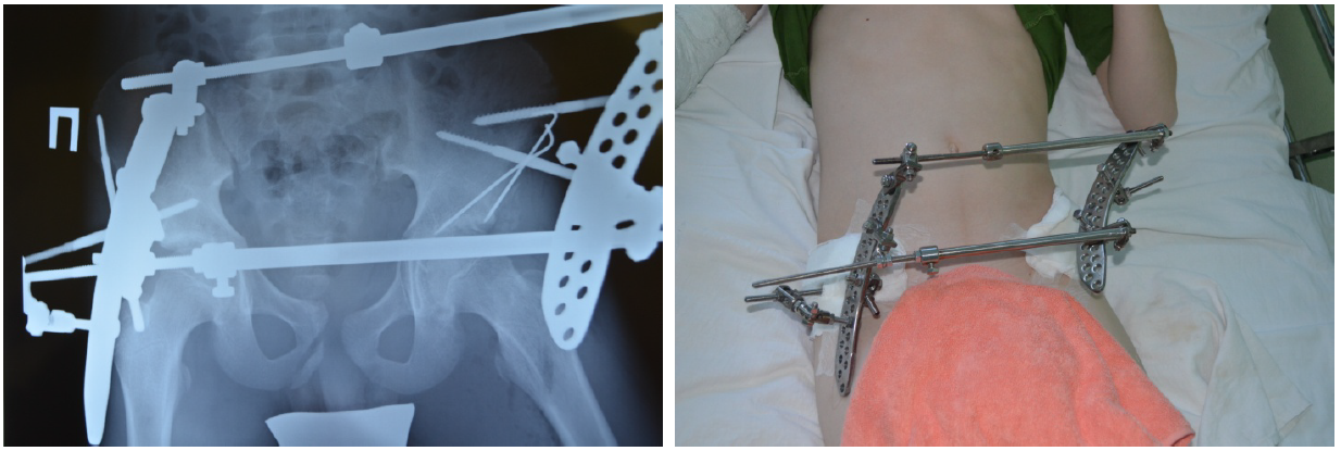 Пациент достаточно легко перенес предложенную наружную фиксацию, аппарат демонтирован через 5 недель после вмешательства, погружные спицы из таза удалены через 5 месяцев после операции через мини-доступ. Осевая нагрузка начата через 3,5 месяца после травмы.