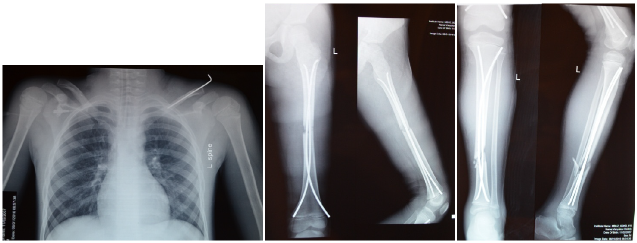 6. Fig. 5. Patient K., 10 years old. The result of simultaneous surgery on three segments (collarbone, hip, tibia), performed two hours after a road injury