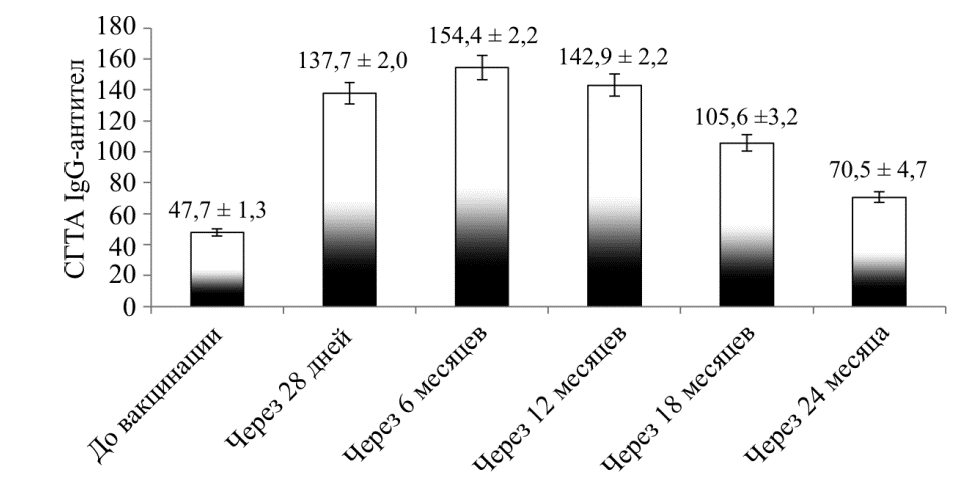 До иммунизации | 610 | 590; 630 | 49,8 ± 2,3 | 510 | 500; 520 | 45,8 ± 1,2 |