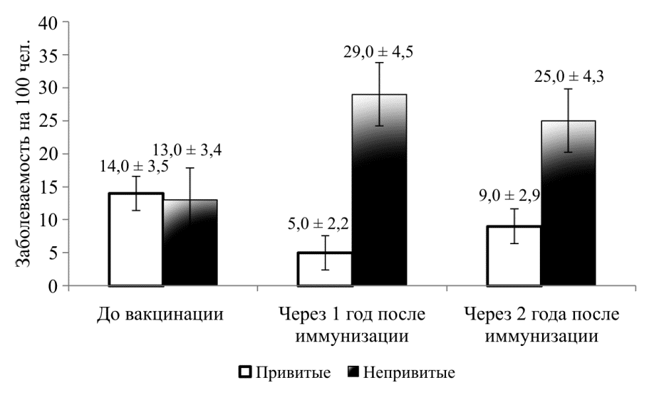Рис. 2. Профилактическая эффективность пневмококковой вакцины при иммунизации ВИЧ-инфицированных пациентов через 1 и 2 года после вакцинации в сравнении с довакцинальными показателями (на 100 ± m)