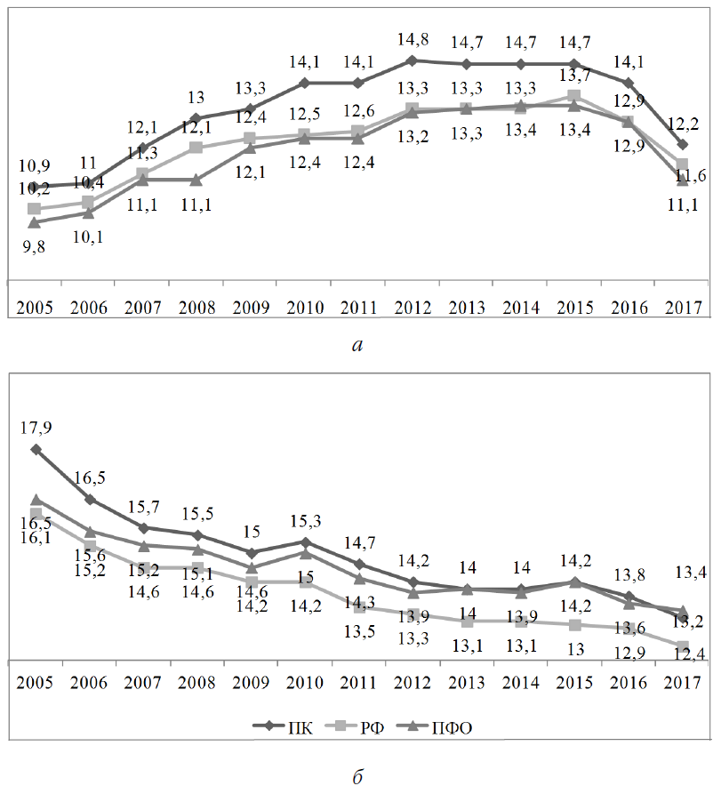 Рис. Рождаемость (а) и смертность (б) населения по ПК, РФ, ПФО за период 2005–2017 гг. (на 1000 населения)