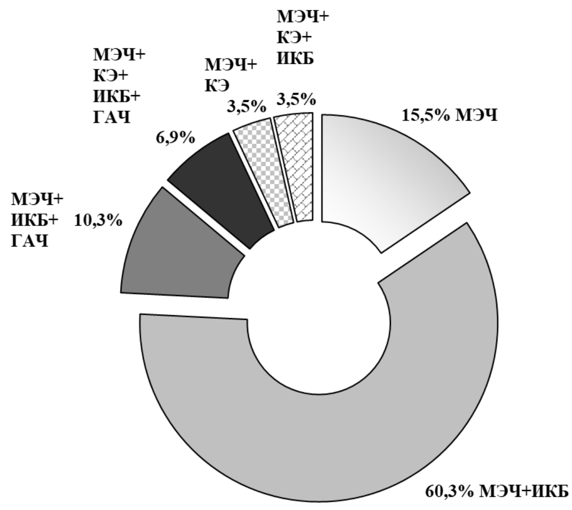 МЭЧ в виде моно- и микст-инфекций диагностировался у 58 (9,9 %) пациентов (рисунок). Из них в виде моноинфекции – у 9 (15,5 %), в виде микст-инфекции с ИКБ, КЭ и ГАЧ – у 49 (84,5 %). Были выявлены следующие микст-инфекции: МЭЧ+ИКБ – у 35 (60,3 %), МЭЧ+ИКБ+ГАЧ – у 6 (10,3 %), МЭЧ+КЭ+ИКБ+ГАЧ – у 4 (6,9 %), МЭЧ+КЭ – у 2 (3,5 %), МЭЧ+КЭ+ИКБ – у 2 (3,5 %).