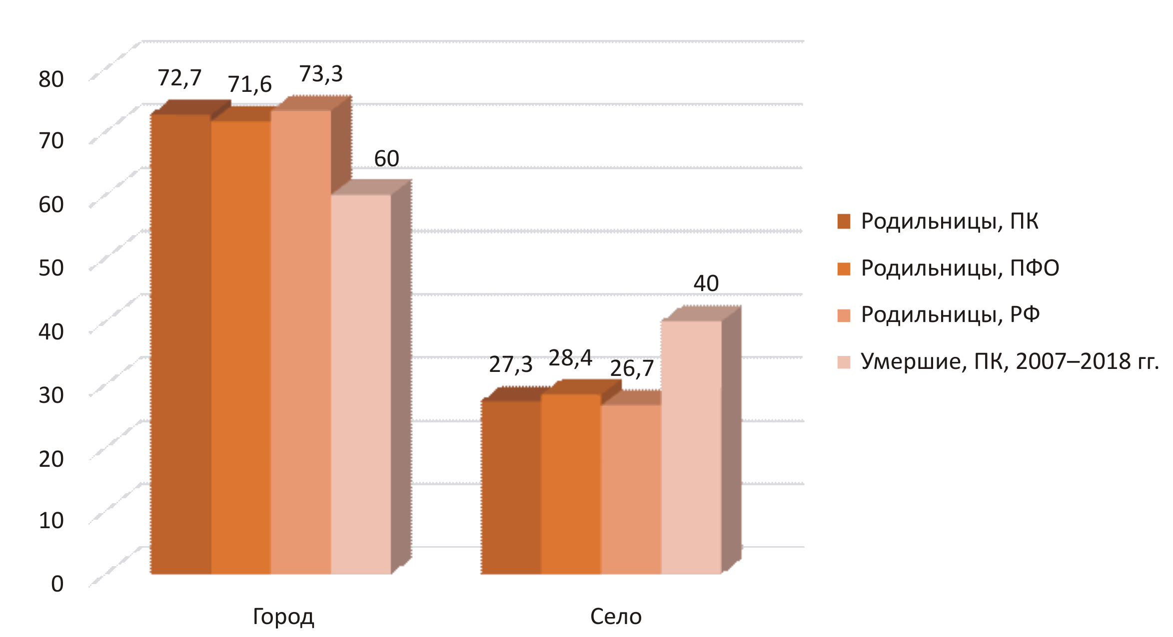 Структура всех родильниц с благополучными исходами ПК, ПФО, РФ из городов и сел полностью отличалась от таковой при МС: из городов доля всех родильниц составила 72,7; 71,6 и 73,3 % соответственно, что в 1,2 раза выше относительно количества умерших женщин (p < 0,05). Одна треть женщин – 27,3; 28,4 и 26,7 % соответственно – была из сельской местности, что в 1,5 раза меньше, чем среди погибших женщин (p < 0,05).