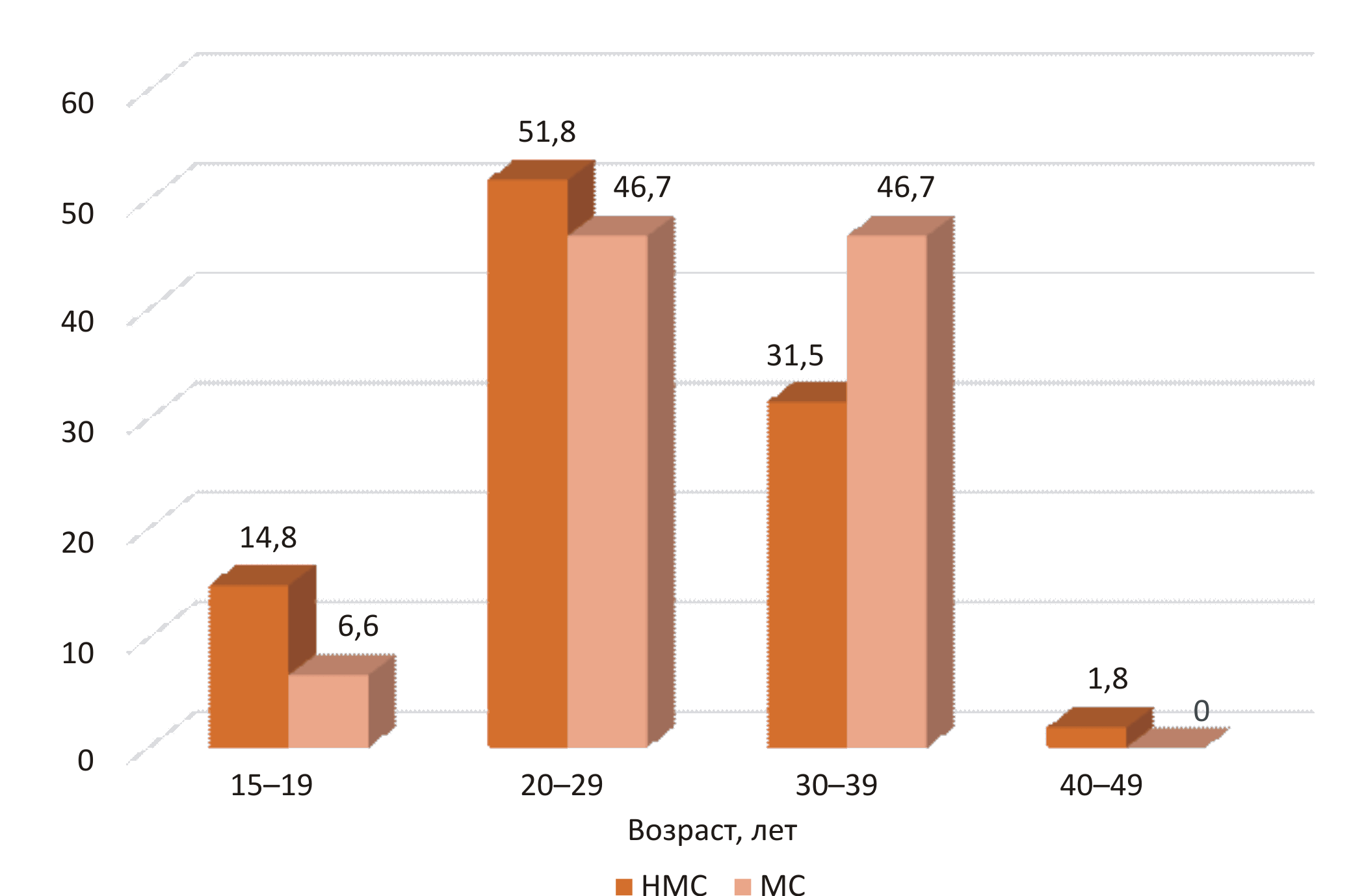Доля родильниц в возрасте 20–29 лет в ПК, ПФО и РФ составила 59,3 % (p < 0,05); 62,5 % (p < 0,05) и 60,2 % (p < 0,05) соответственно. Второе место в ПК занимали женщины с НМС в возрасте 30–39 лет – 31,5 % (МС в этом возрастном периоде – 46,7 %) (p < 0,05). Доля родильниц в возрасте 30–39 лет в ПК, ПФО и РФ равна 29,6 % (p < 0,05); 27,9 % (p < 0,05) и 29,1 % (p < 0,05) соответственно.
