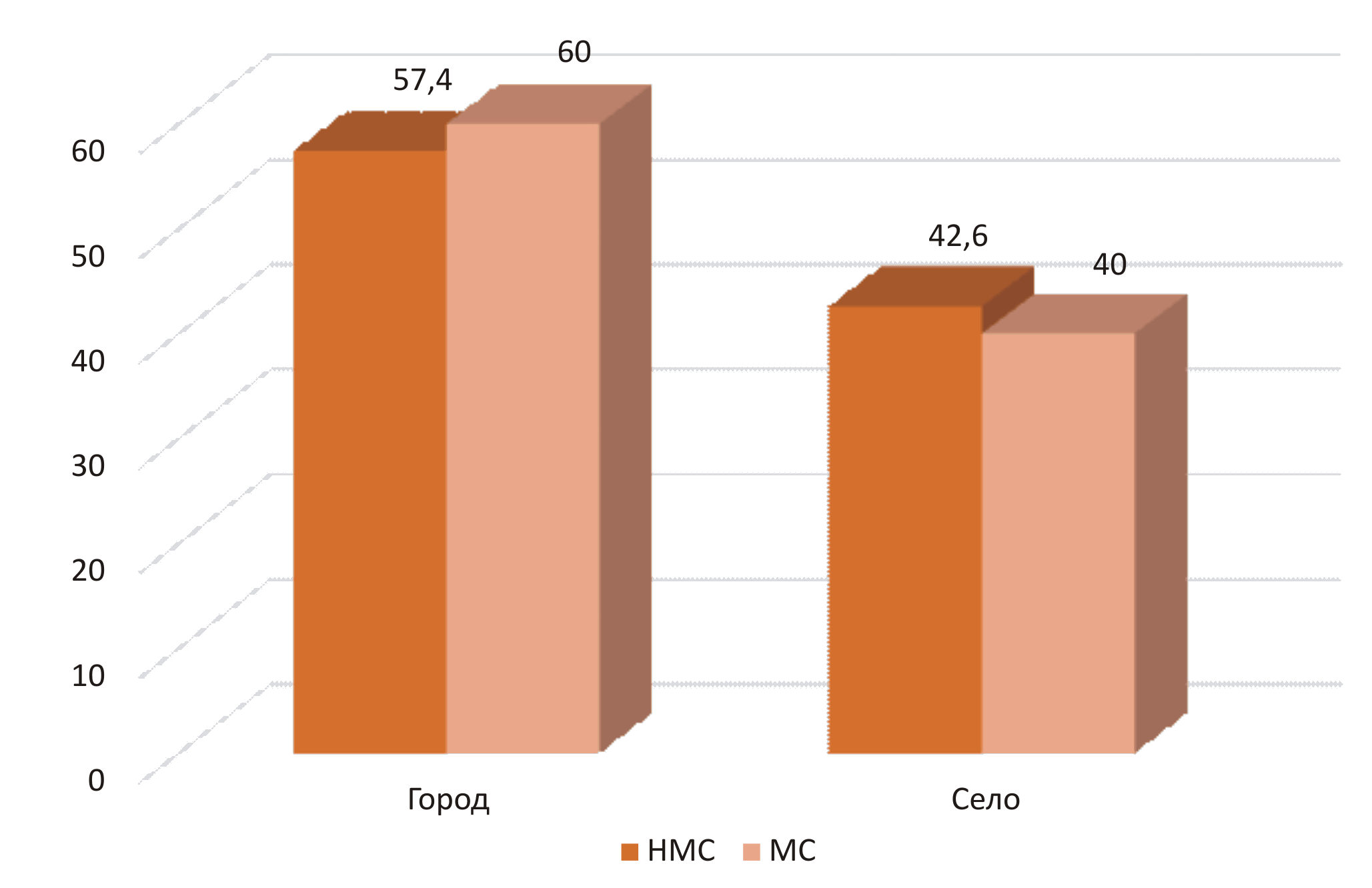 По месту жительства женщины с НМС не отличались от соответствующих данных при МС: 57,4 % в городе и 42,6 % в селе, среди умерших женщин 60,0 и 40,0 % соответственно (p > 0,05) (рис. 4).