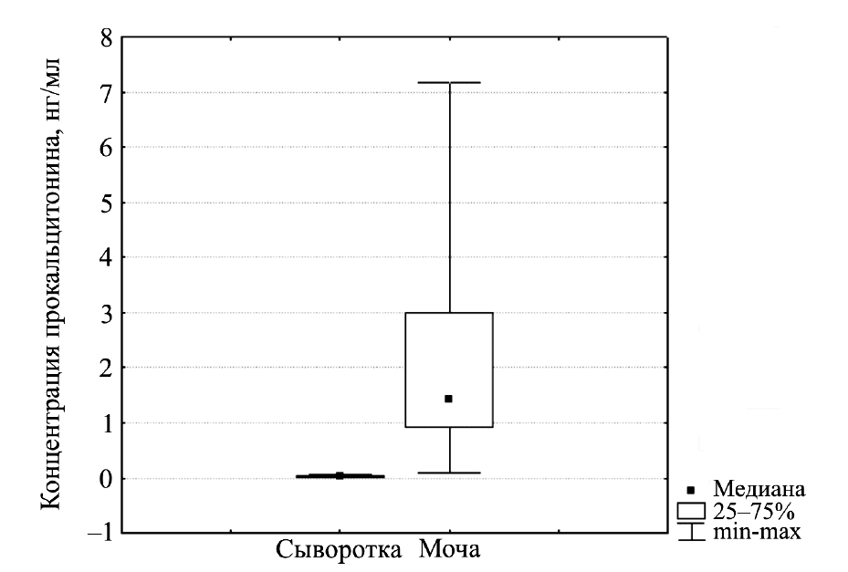 Рис. 1. Концентрация прокальцитонина, нг/мл, в сыворотке крови и моче
