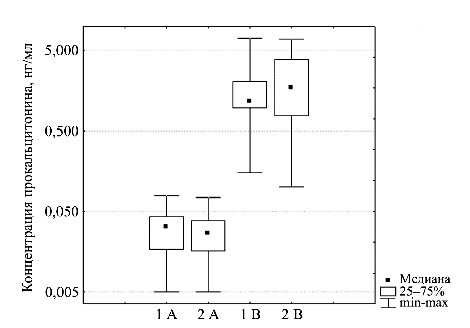 Рис. 2. Концентрация прокальцитонина в сыворотке крови (А) и моче (В) у мужчин (1) и женщин (2)