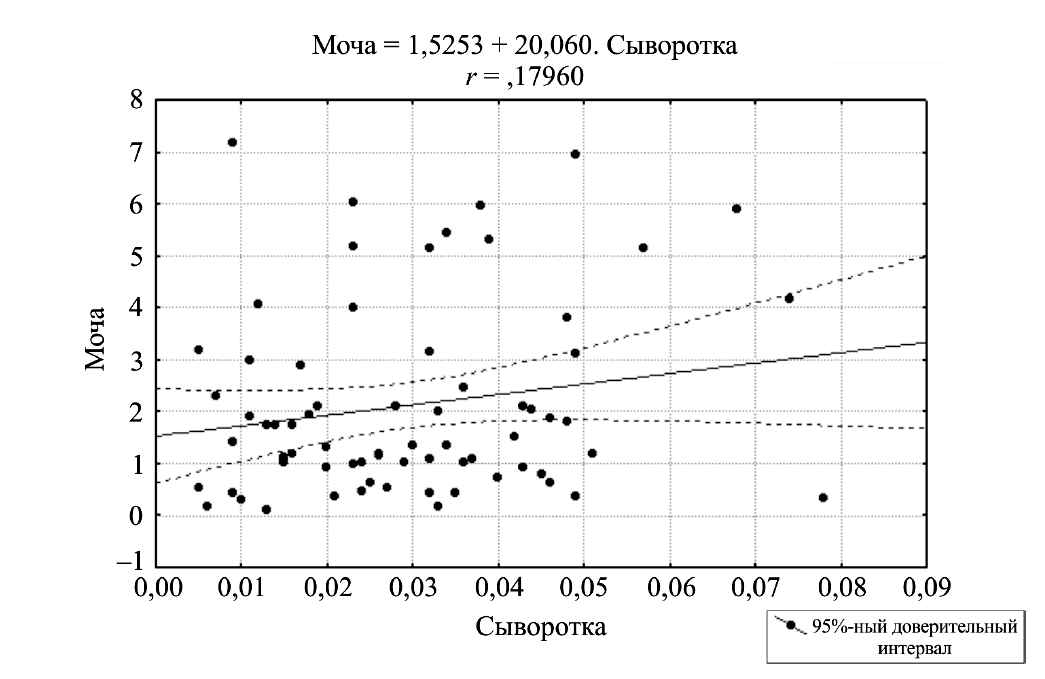 При оценке коэффициентов линейной корреляции между содержанием ПКТ в сыворотке крови и в моче установлена слабая положительная зависимость (R = 0,302782). Уравнение линейной регрессии, описывающее зависимость, представлено на рис. 3.